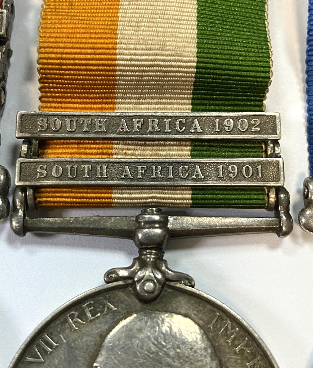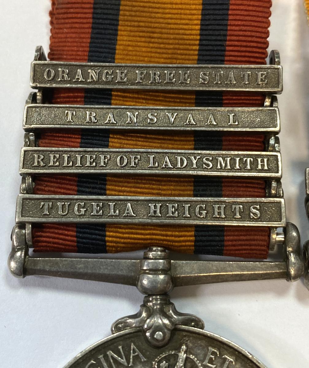 Named to 82692 DR J.H. BAILS, 19th BTY R.F.A.  Four bar Queen's South Africa comprising Orange Free State, Transvaal, Relief Of Ladysmith, Tugela Heights. Two bar King's South Africa has South Africa 1901 and South Africa 1902.