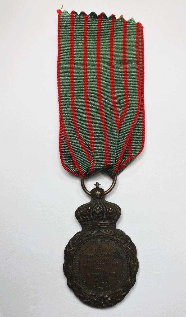 | The Saint Helena Medal was established in 1857 by a decree of emperor Napoleon III to recognise participation in the campaigns led by emperor Napoleon I. The Saint Helena Medal was awarded to all French and foreign soldiers, from the land armies or naval fleets, who served the Republic or the Empire between the years 1792 and 1815 inclusive. |