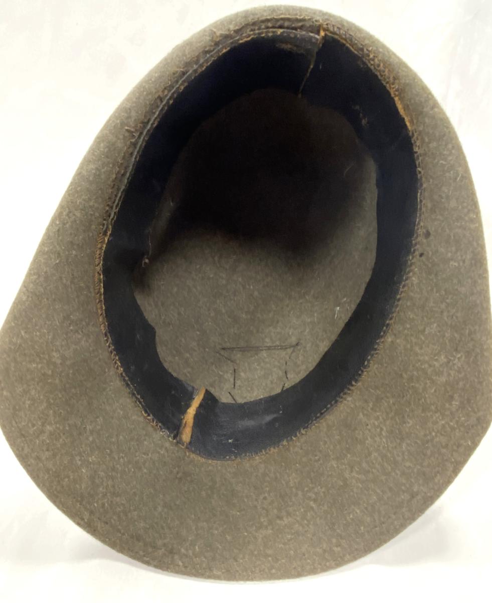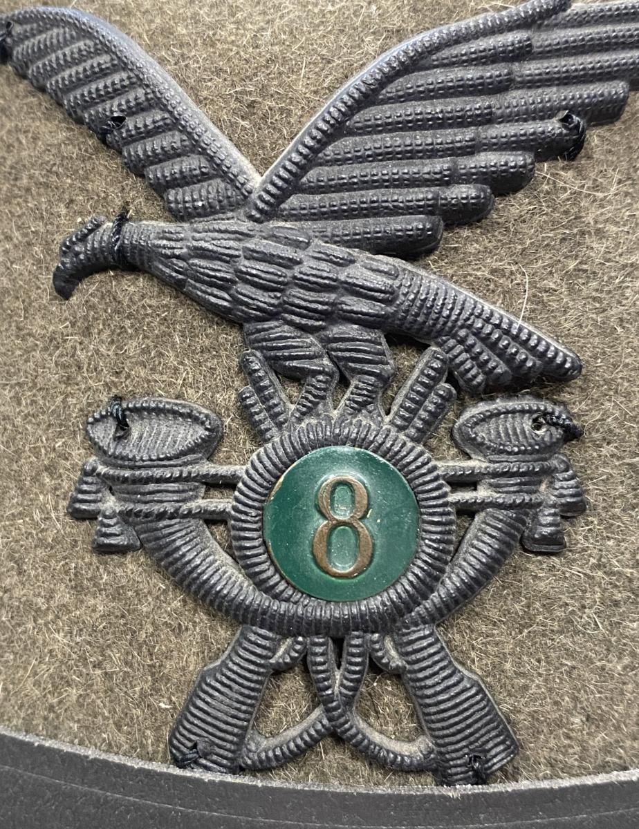 Good condition with stitched badge to front with enamel green regimental number 8. Interior black leather sweatband present. Feather in good condition. Two grommets missing.