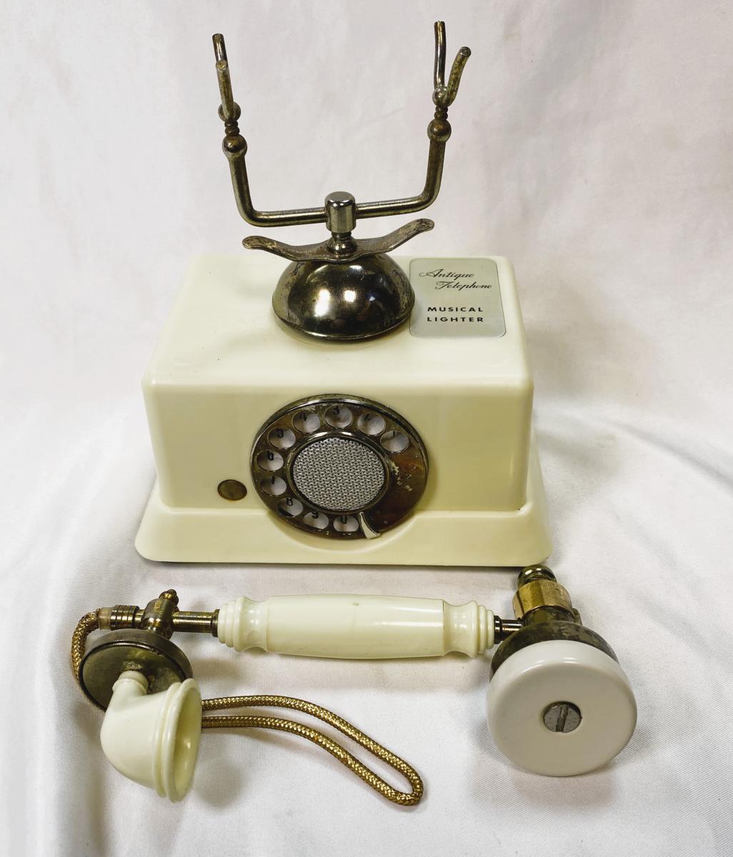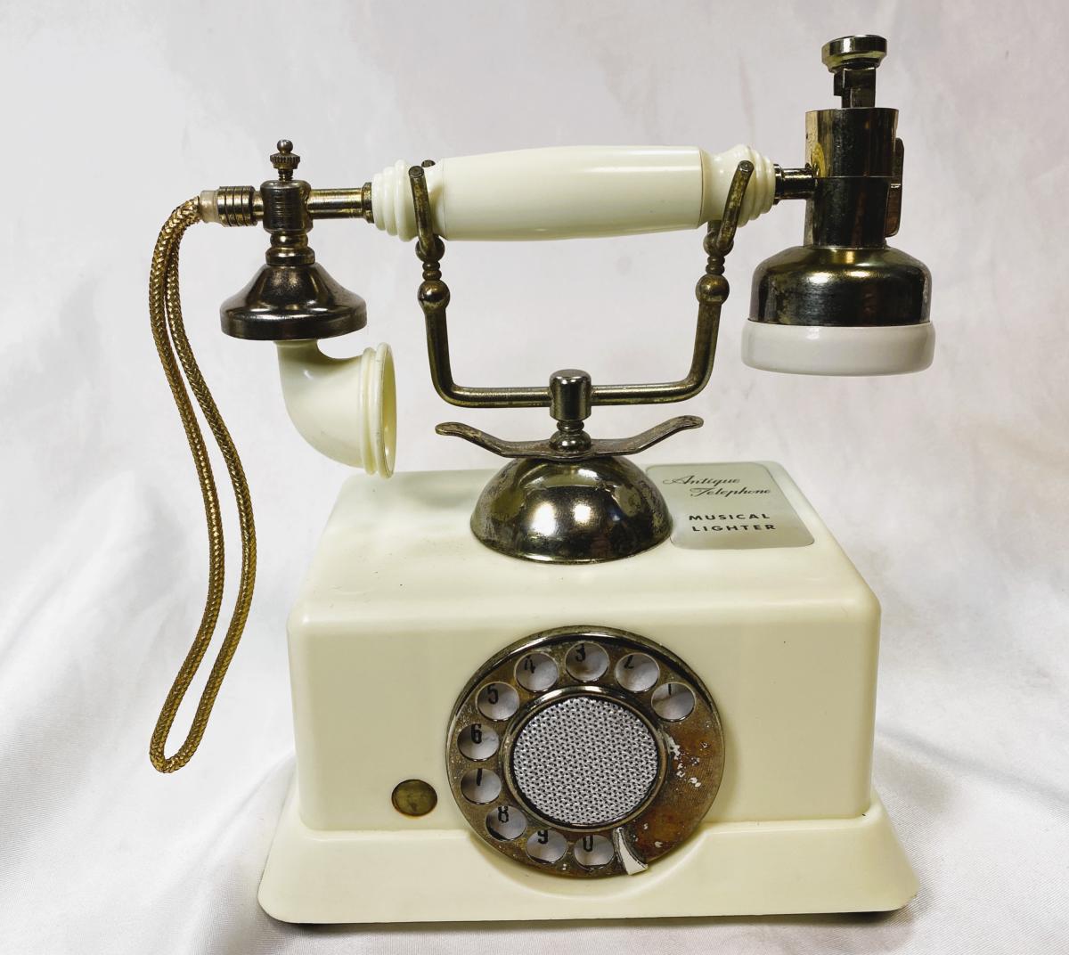 Wind up music bow made in Japan in the 1960's. Music plays when the receiver is lifted and the lighter is located in the ear piece of the telephone receiver.