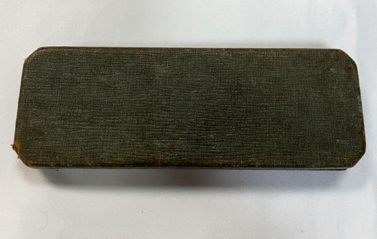 (Code: 2382) | |  Case in good condition with simulated leather case in grey and blue flock interior .The lid has slightly detached from the hinges but still closes and opens as the cloth is attached to the lid. Case lid stamped 'STORES REF 22C/1073 SPECTACLES MARK VIII A AIRCREW ANTI-GLARE LARGE 8788' .Has War Dept stamp. |