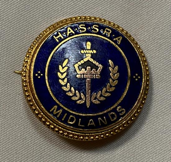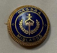 (Code: 2114) | |  Blue/gold Enamel badge with pin. Gold version is higher achievement grade and quality than the standard enamel badge. HASSRA is the 'Health and Social Security Recreational Association'' . Maker stamp to reverse ''EMSLIE '' with phone number. Emslie specialised in badge making. Today they specialise in signage and engraving.