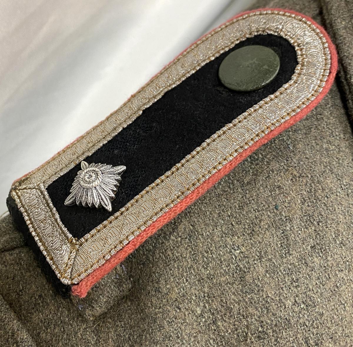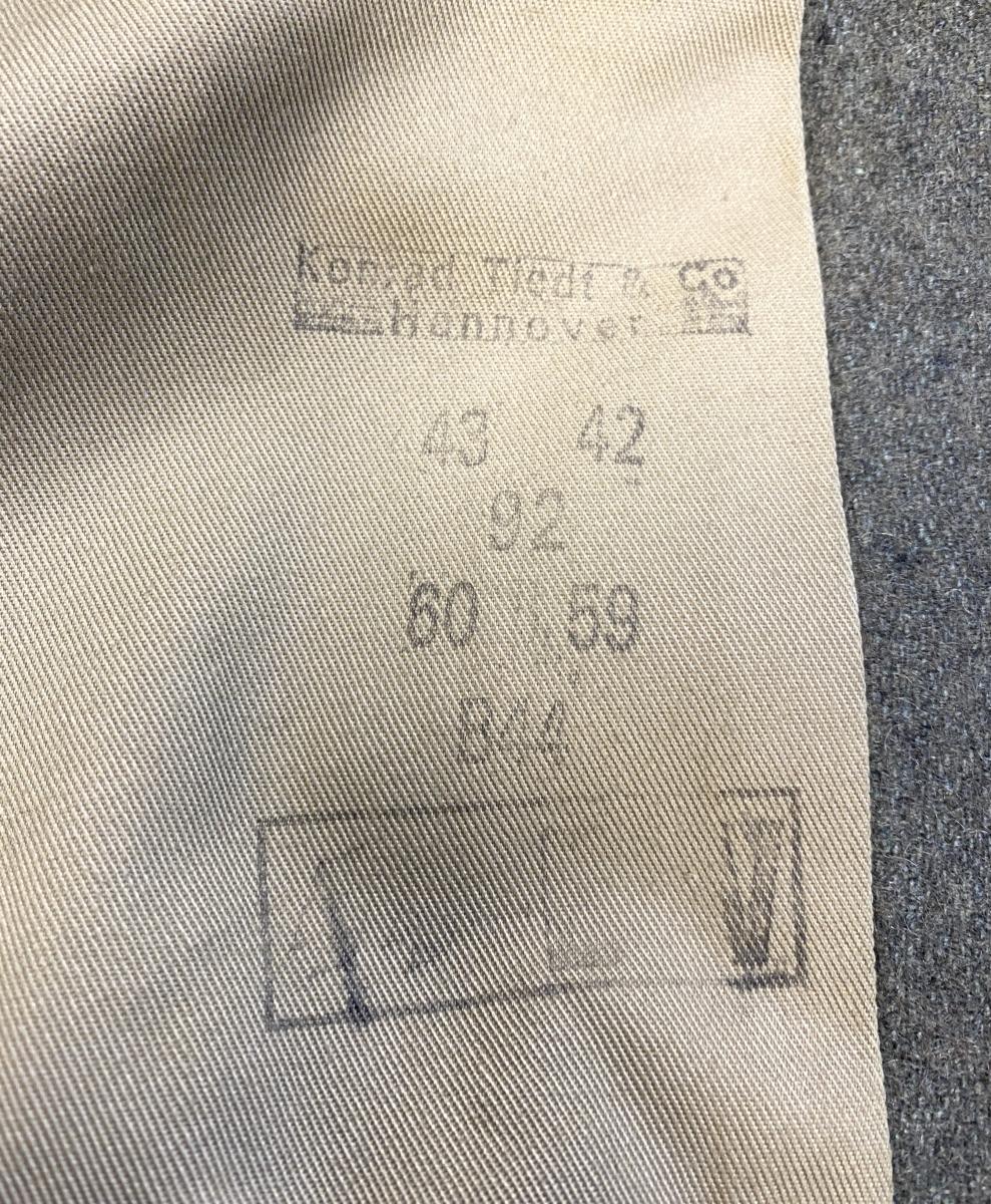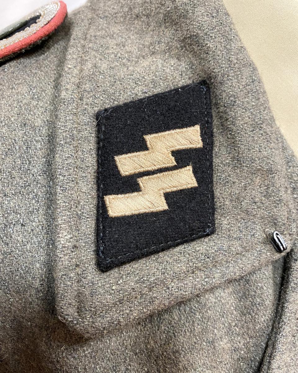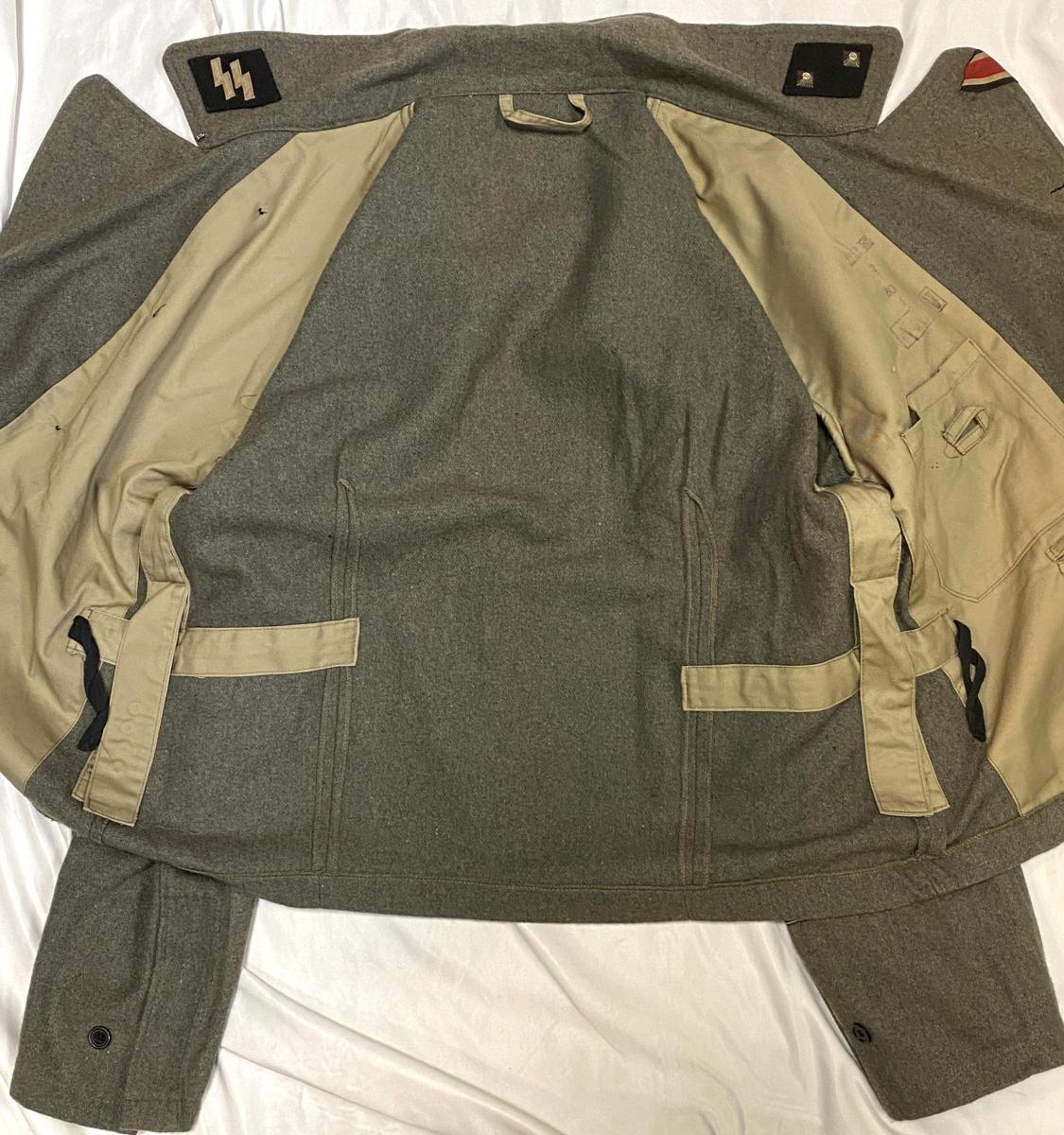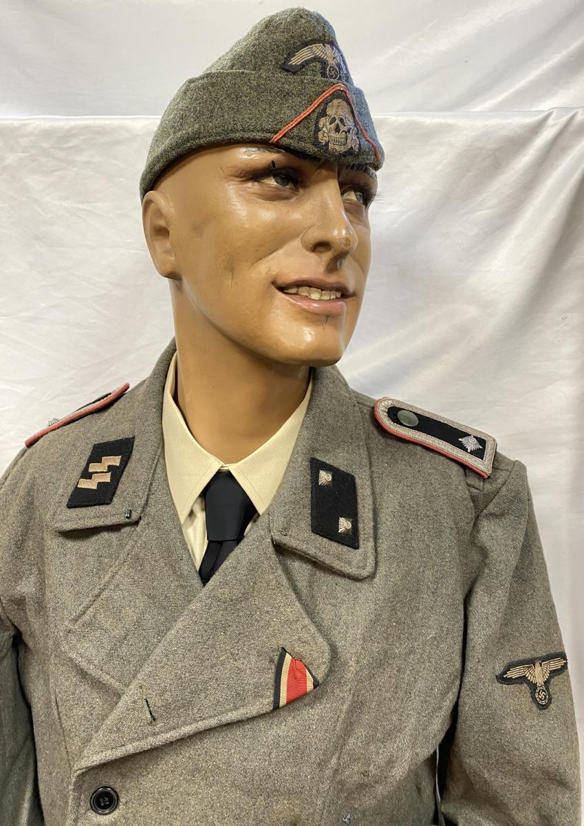 Museum quality replica of the Waffen SS feldgrau assault gun wrap tunic worn by Panzerjager and Sturmgeschutz crews. Grey green wool construction with wool and tan rayon interior lining. Interior has size and maker stamps with 1944 date. Collar and shoulderboard insignia for a Obersharfuhrer. Collar insignia of black wool base with runes in silver embroidered threads.Rank collar tab of two alloy pips on black wool base. Shoulderboards of silver aluminium tress with pink waffenfarbe on black wool base with grey rayon lining. Iron Cross 2nd Class ribbon to buttonhole. Two medal loops stitched to left breast. All bakelite buttons are present. Left sleeve has a Waffen SS sleeve eagle in silver bevo machine woven threads on black rayon base. Lower left sleeve has a 'Gotz Von Berlichingen' cuff title of machine embroidered bevo construction. Feldgrau wool Panzer M40 cap with pink soutache to front, machine embroidered bevo eagle of silver aluminium threads on black rayon base, and Totenkopf skull of bevo machine woven silver grey threads on black rayon base. Interior tan lining in cotton rayon blend. Maker and size stamp to interior lining. Size stamped 61. Shirt and tie not included.