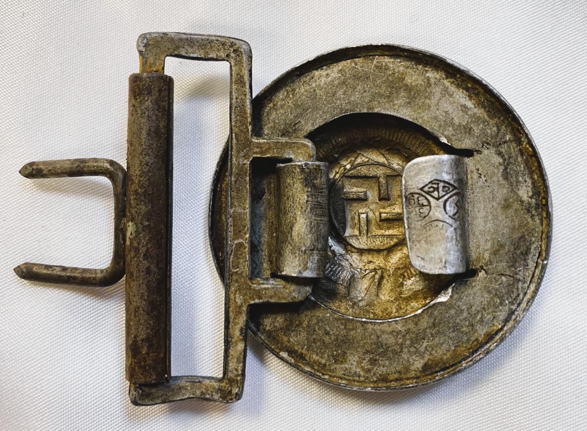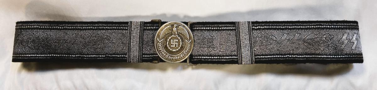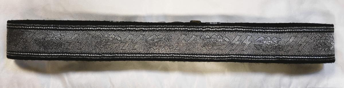 Very high museum quality belt with silver alloy construction buckle. Belt is silver bullion wire construction on a black wool base and black leather tab. Buckle is maker marked on reverse.