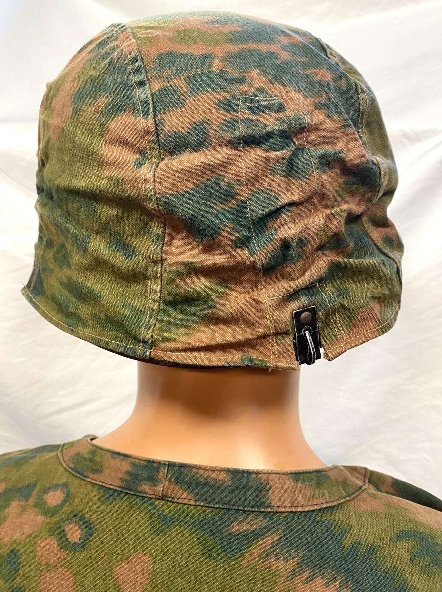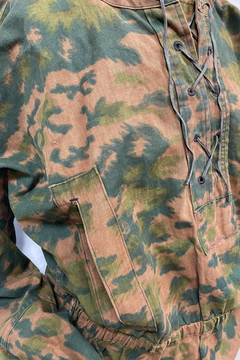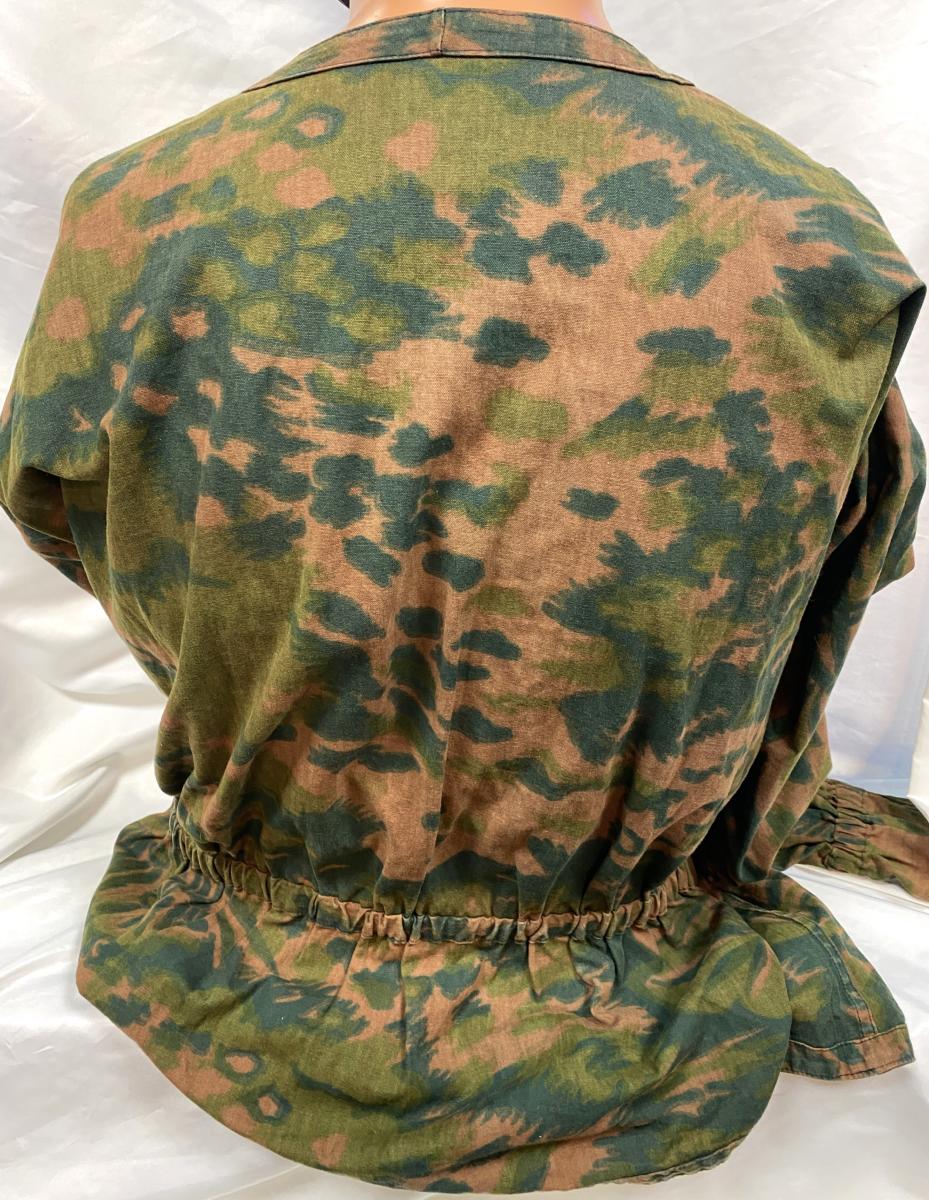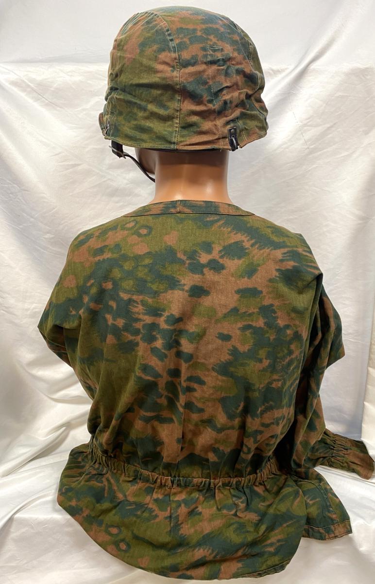 | Very high museum quality replica of the rare palm tree 1st pattern smock, the first type of camouflage used by the SS Verfugungstruppe and hence the Waffen SS. Cotton construction. Summer pattern to one side and autumn pattern to reversible side. With nylon drawstring to the neck closure. Helmet cover palm tree pattern with summer to one side and autumn pattern to reverse. Three attachment rocker clips with looped steel springs within the helmet cover. Helmet not included. |
