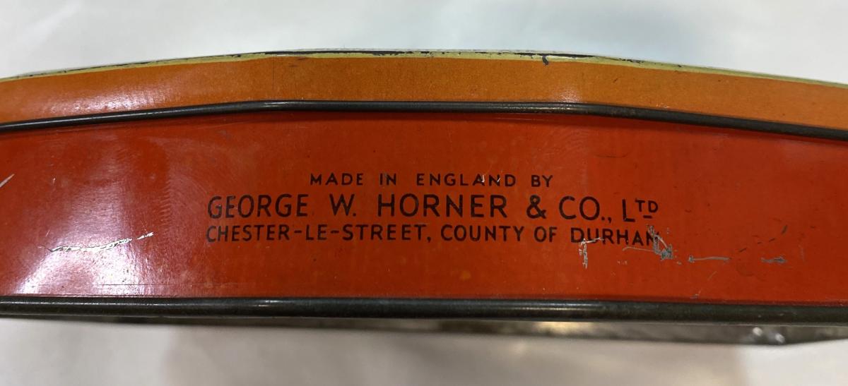 Confectionery tin made by 'George W Horner & Co Ltd, Chester -Le-Street, County of Durham'. Early 1950s. Features Burns Cottage, Ayr. 14 cm long x 3 cm high