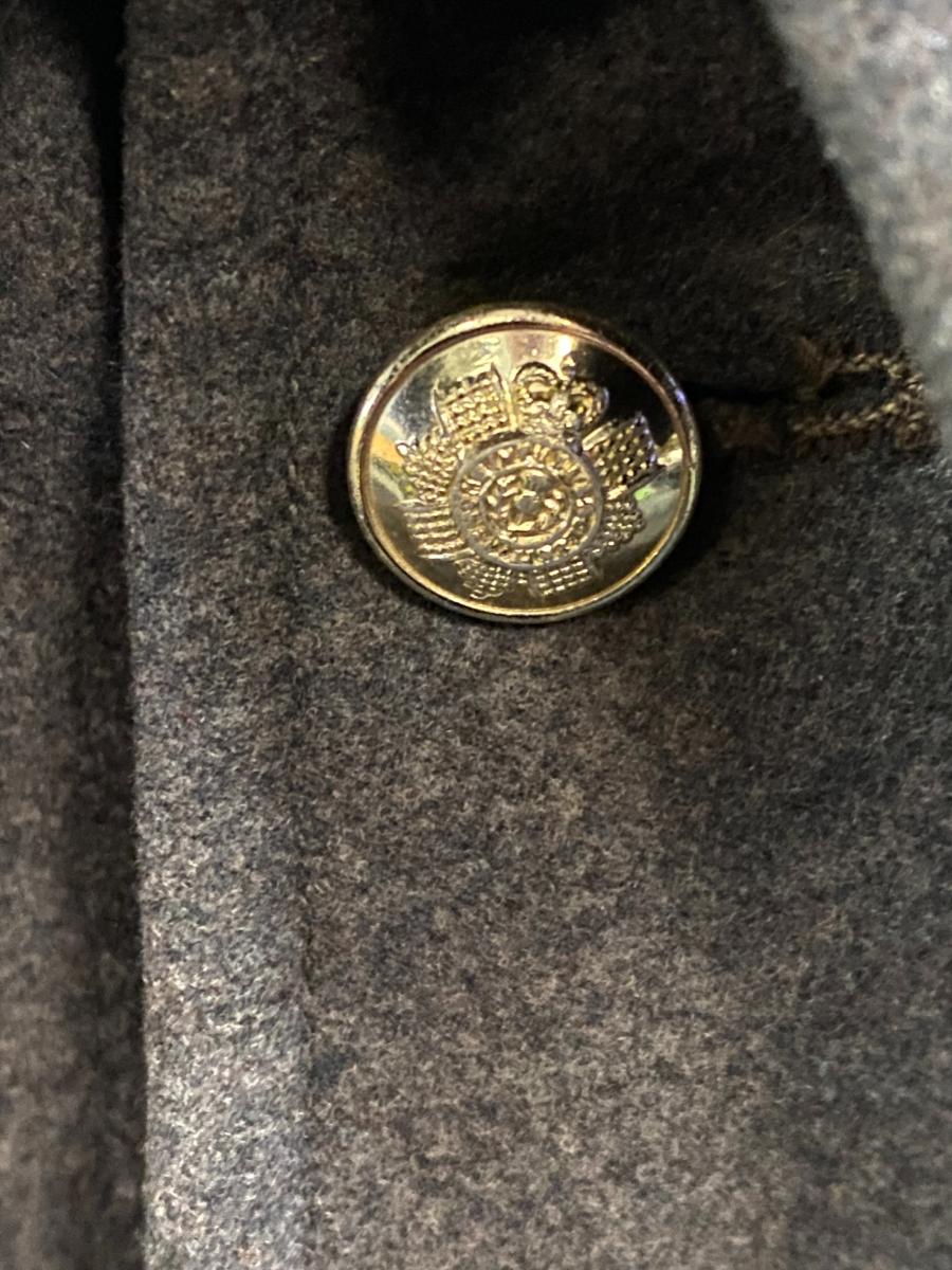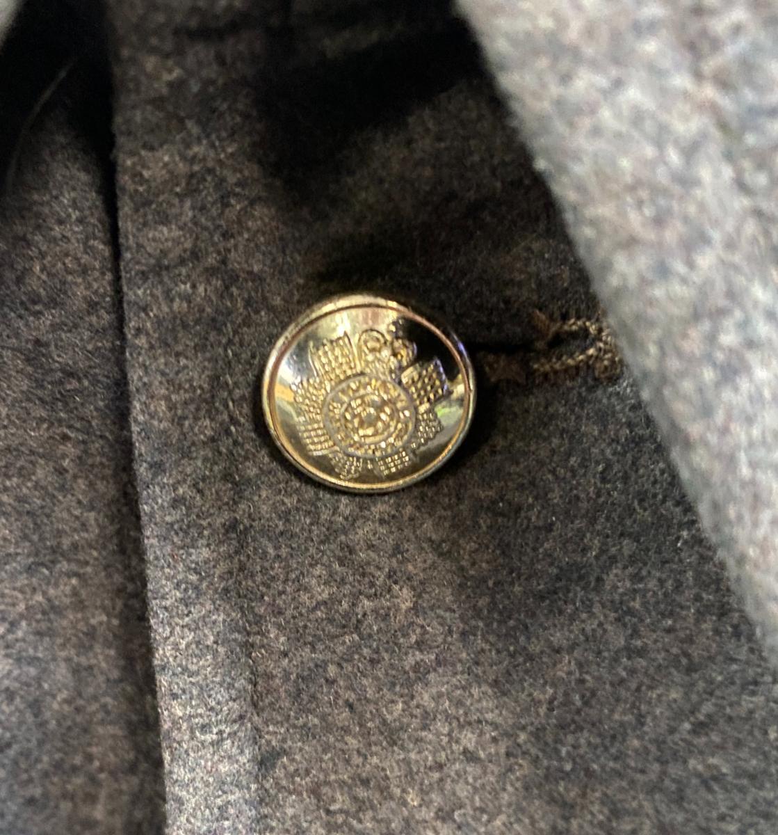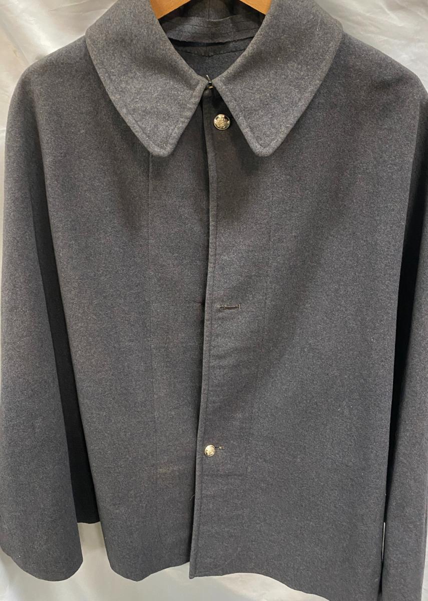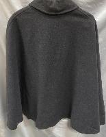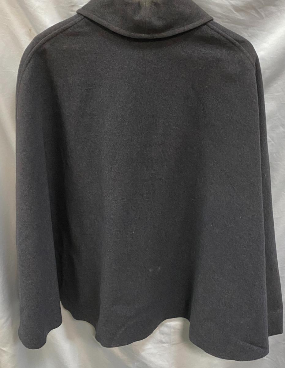 Grey wool cape. One button missing. With label dated 1957