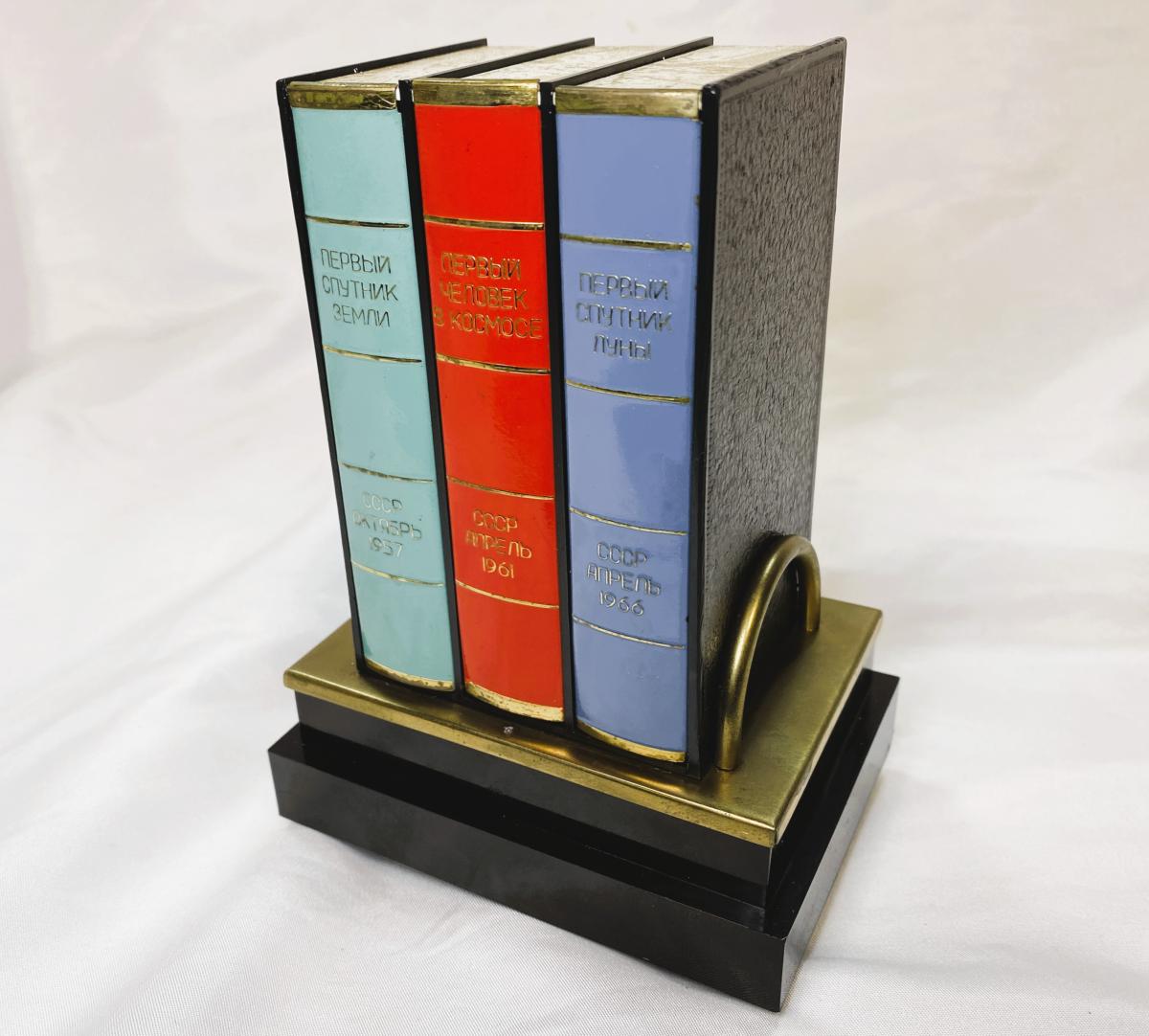 Features a clock word music box and shows book titles from the 1960's Sputnik Space Programme.