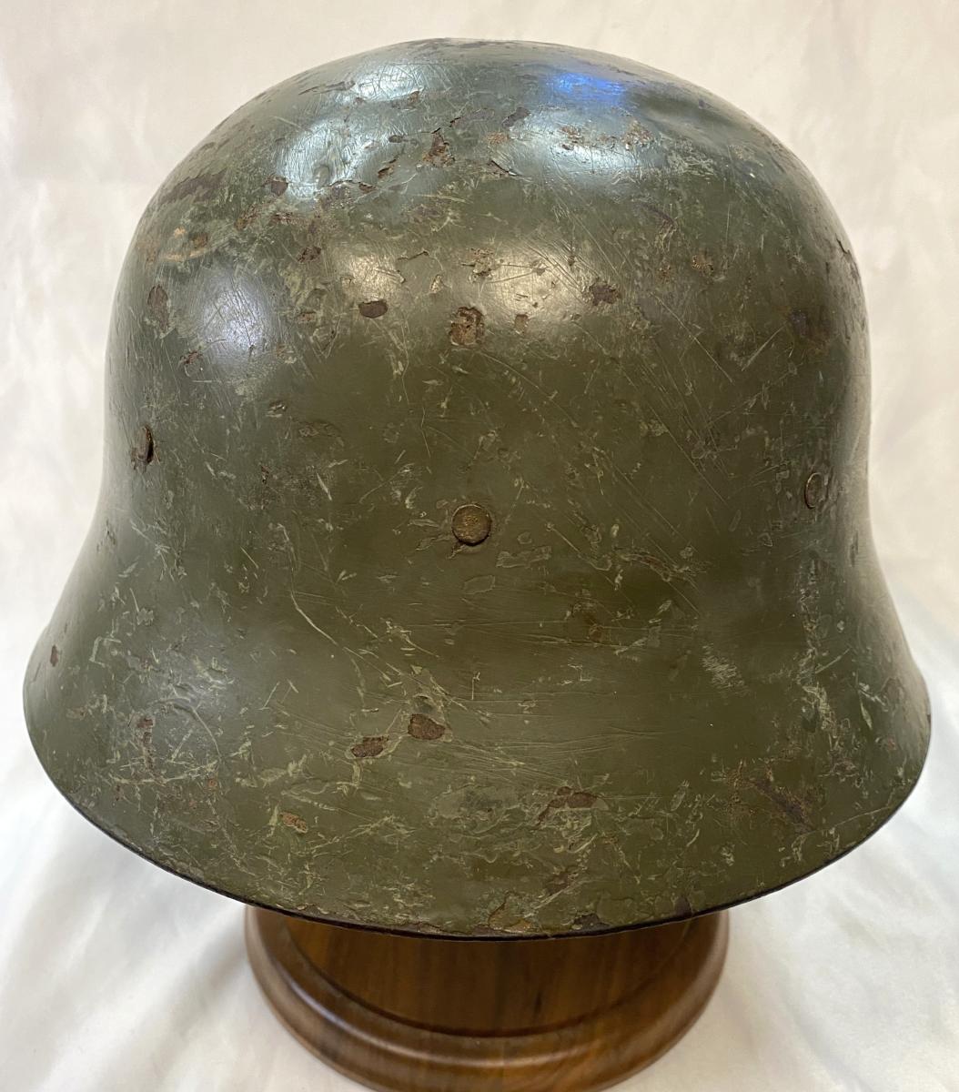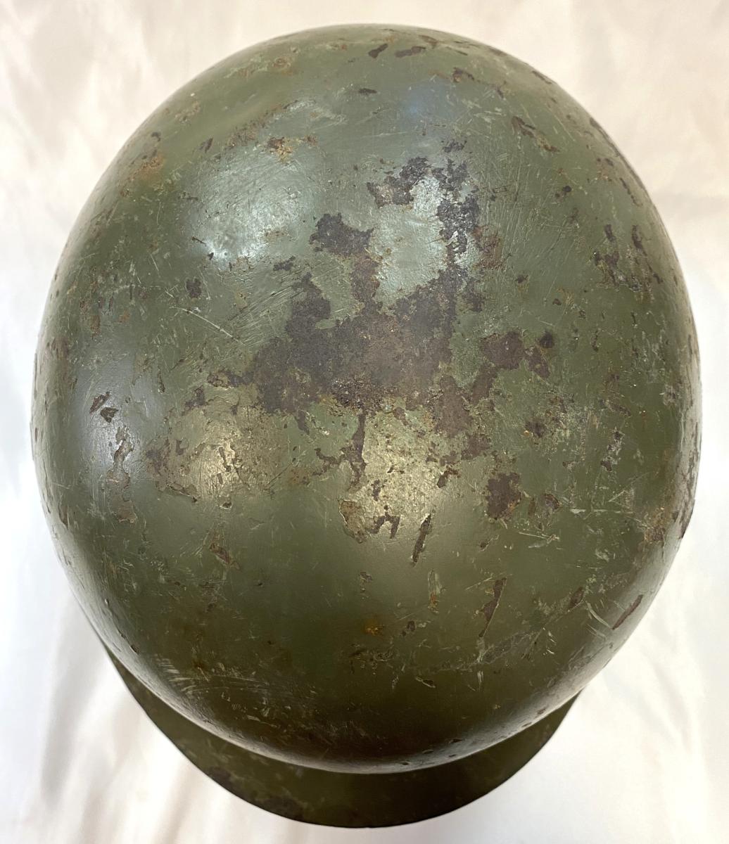 Spanish Modelo Z M42 Army Combat Helmet from the 1950-1970's era. Complete with original liner. M42/79 Liner system is complete and in good condition. Canvas green chinstrap complete. High amount of original green paint remains with some rusting to helmet crown