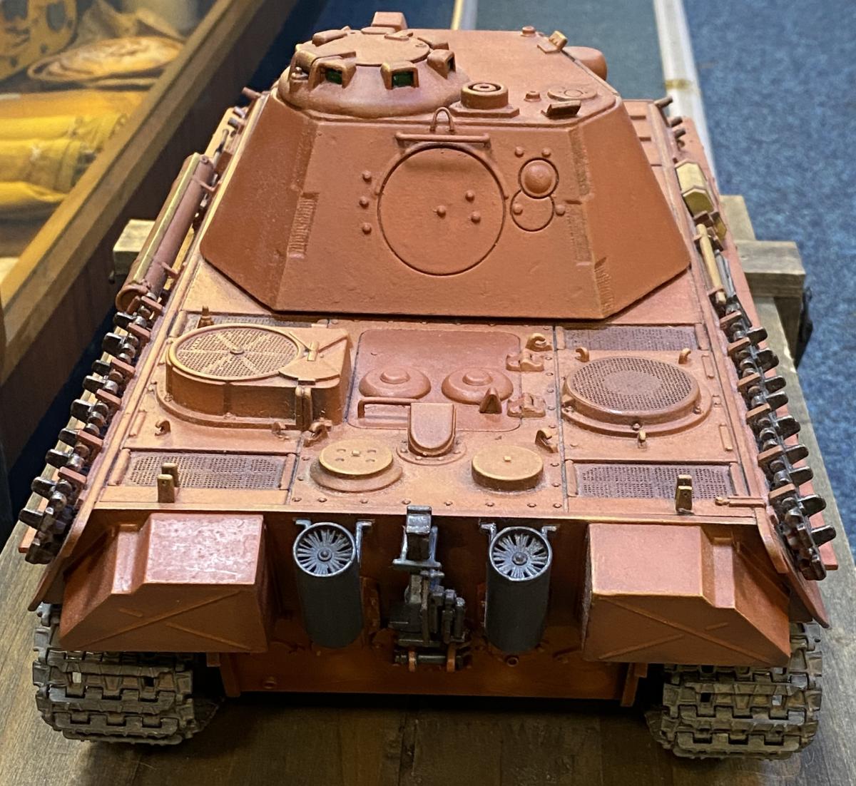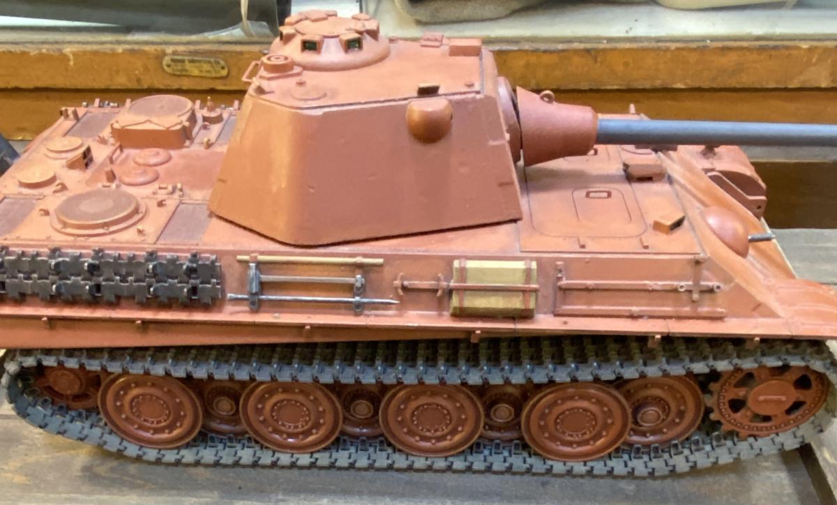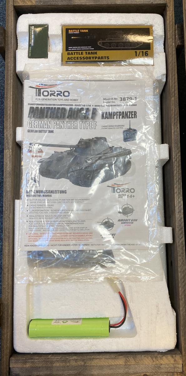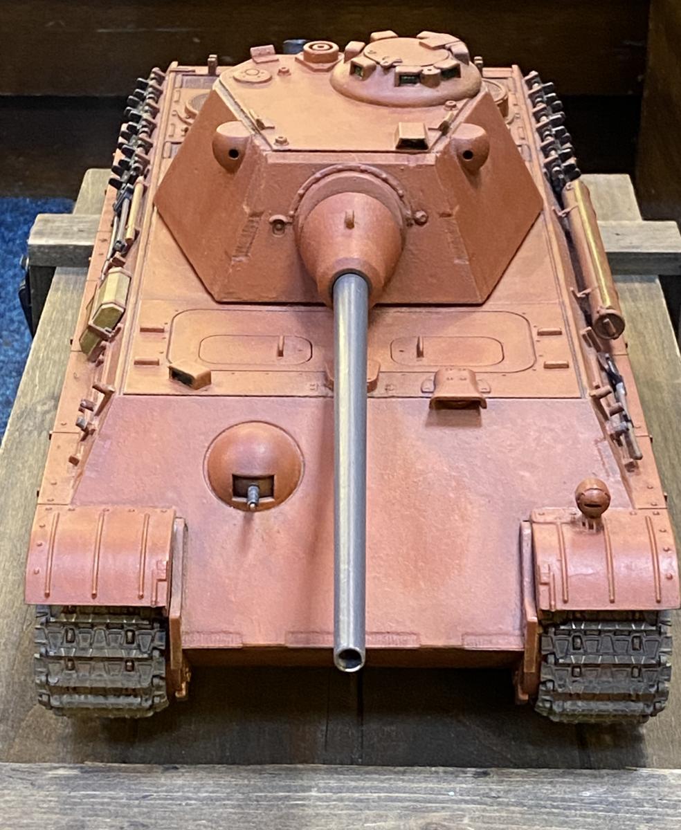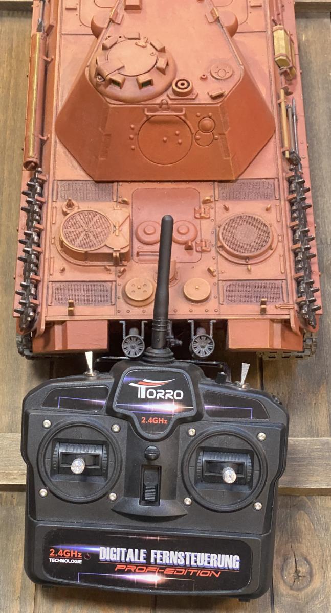 Custom painted in red oxide as if it was leaving the production line. Comes with its wooden crate. Remote control receiver and charger. Turret rotation, engine noises, gun recoil and flash and exhaust smoke. Hull and turret made of metal.