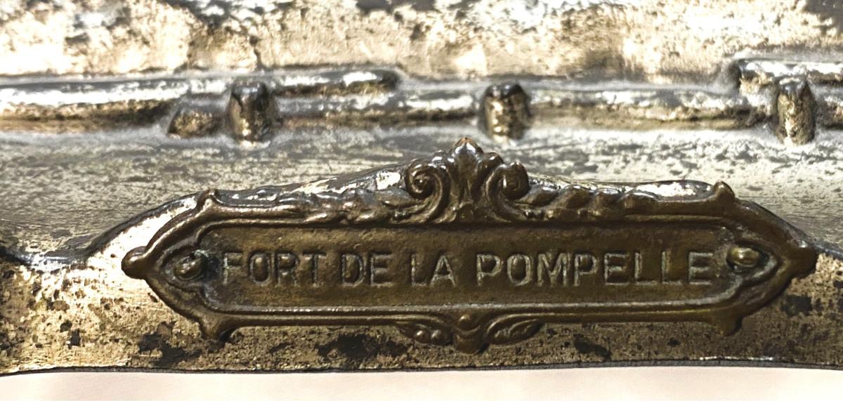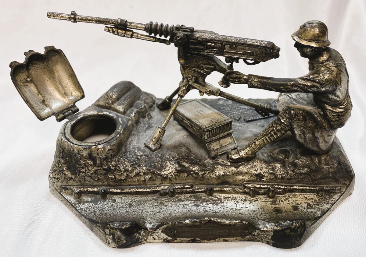Spelter construction. Handle to MG is missing.6.5 Inches long. Sandbags open and close for placing ink pot. Inscribed Fort De La Pompelle to front.