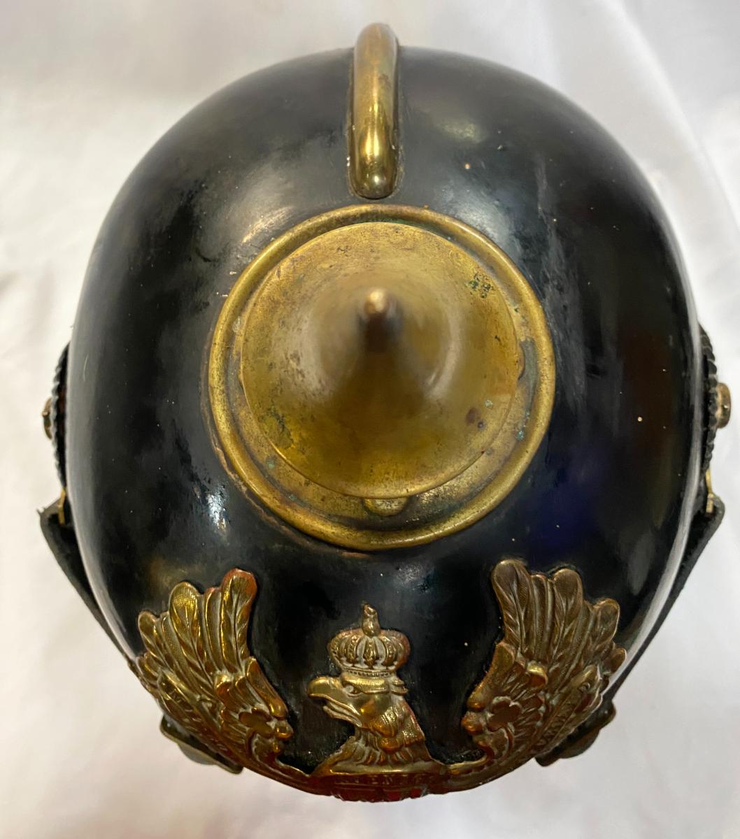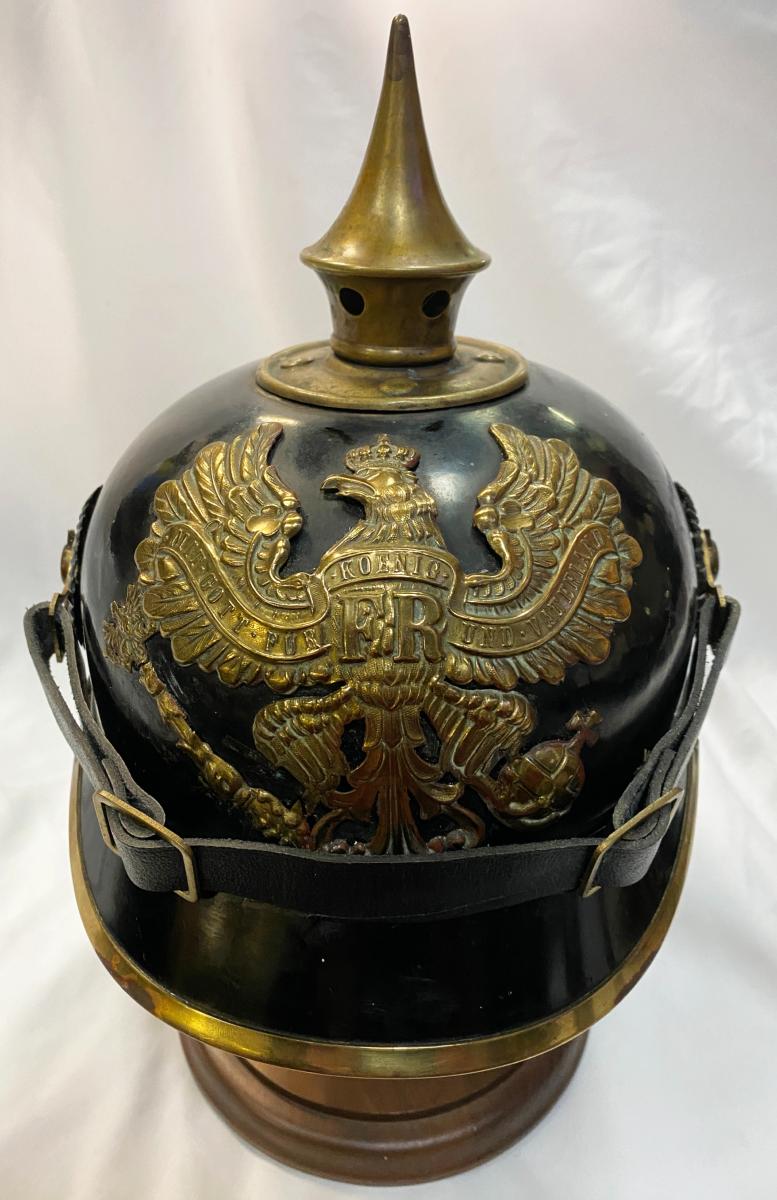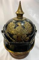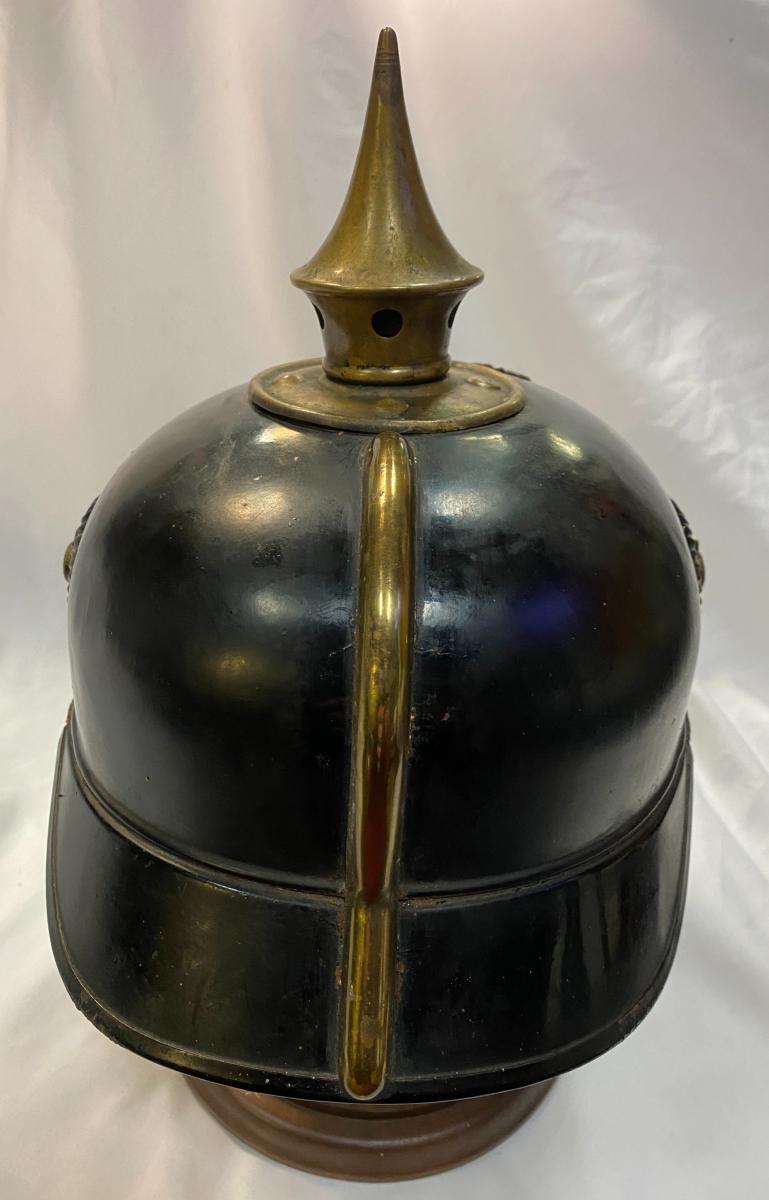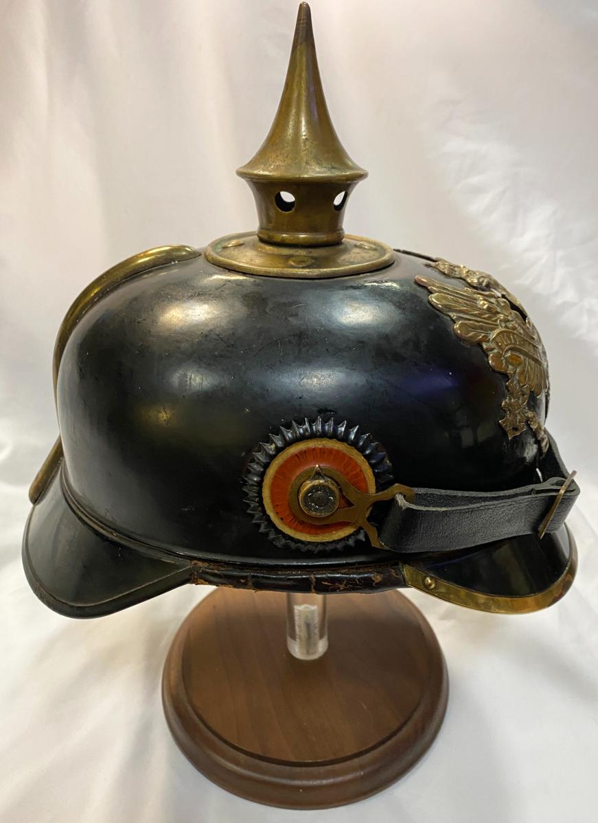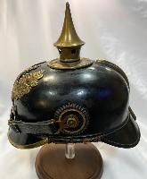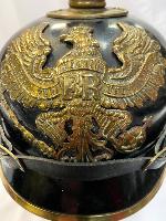 Scarce all tin pickelhaube with brass fittings. All original black finish remaining with no dents. Original cockades with good quality replica chinstrap. Minus liner, beneath peak has faint traces of the maker with 'Berlin' eligible alongside and beneath Berlin can be clearly seen 'No.78' Very Good condition.