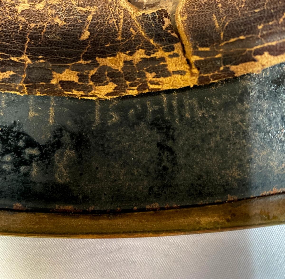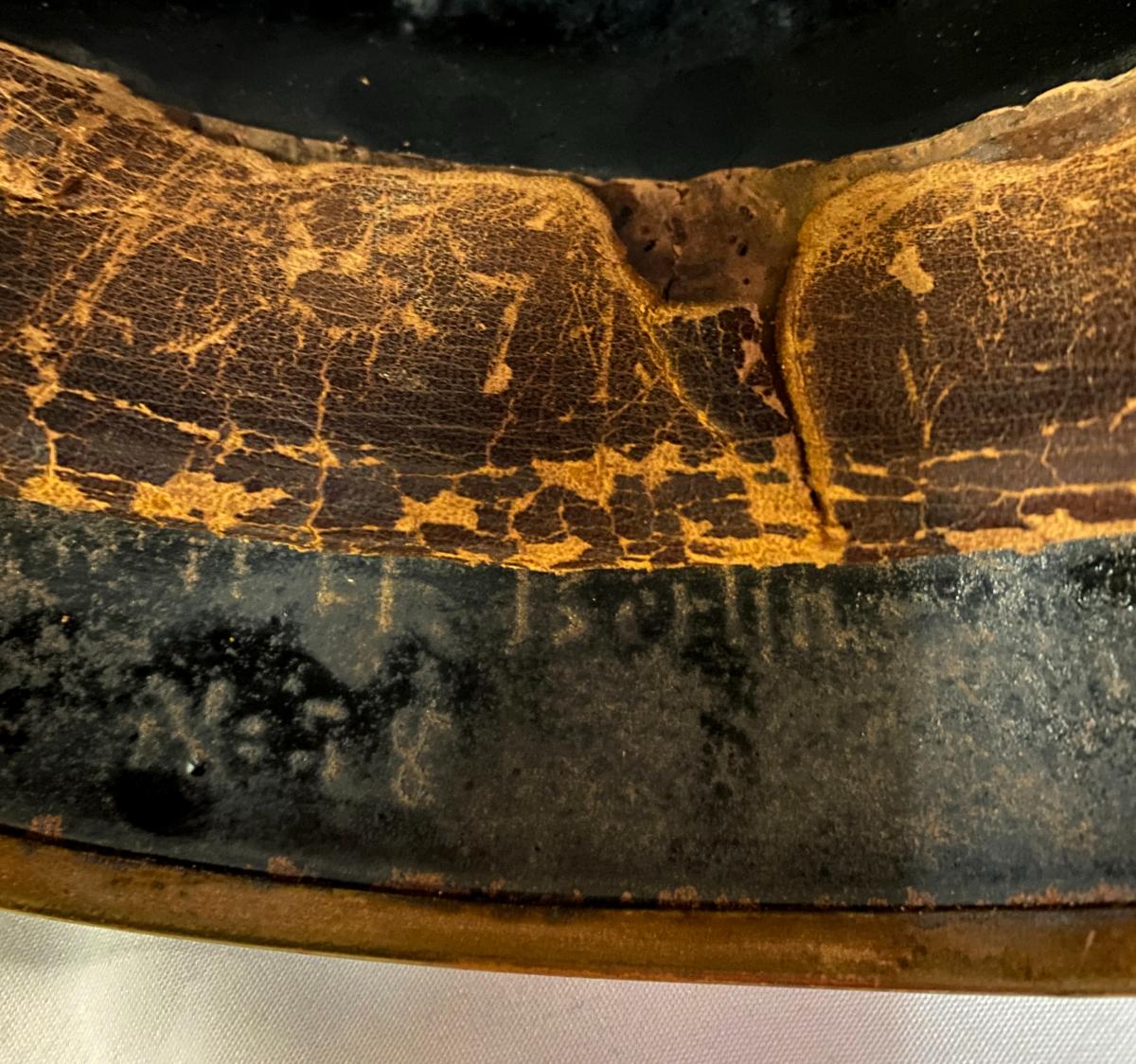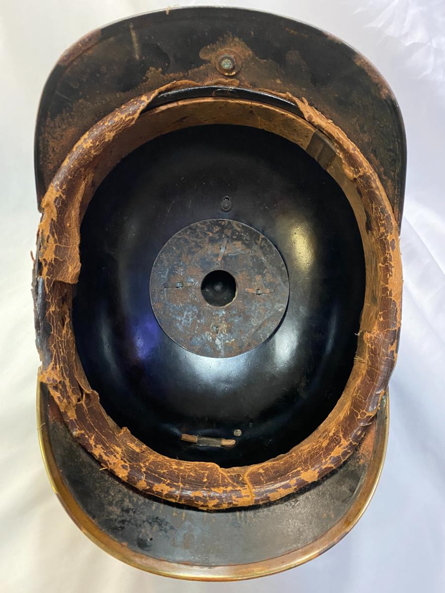 Scarce all tin pickelhaube with brass fittings. All original black finish remaining with no dents. Original cockades with good quality replica chinstrap. Minus liner, beneath peak has faint traces of the maker with 'Berlin' eligible alongside and beneath Berlin can be clearly seen 'No.78' Very Good condition.