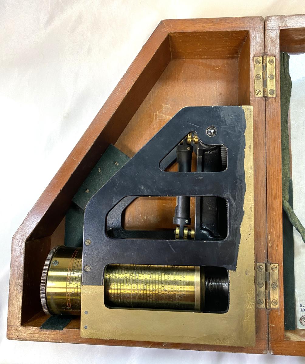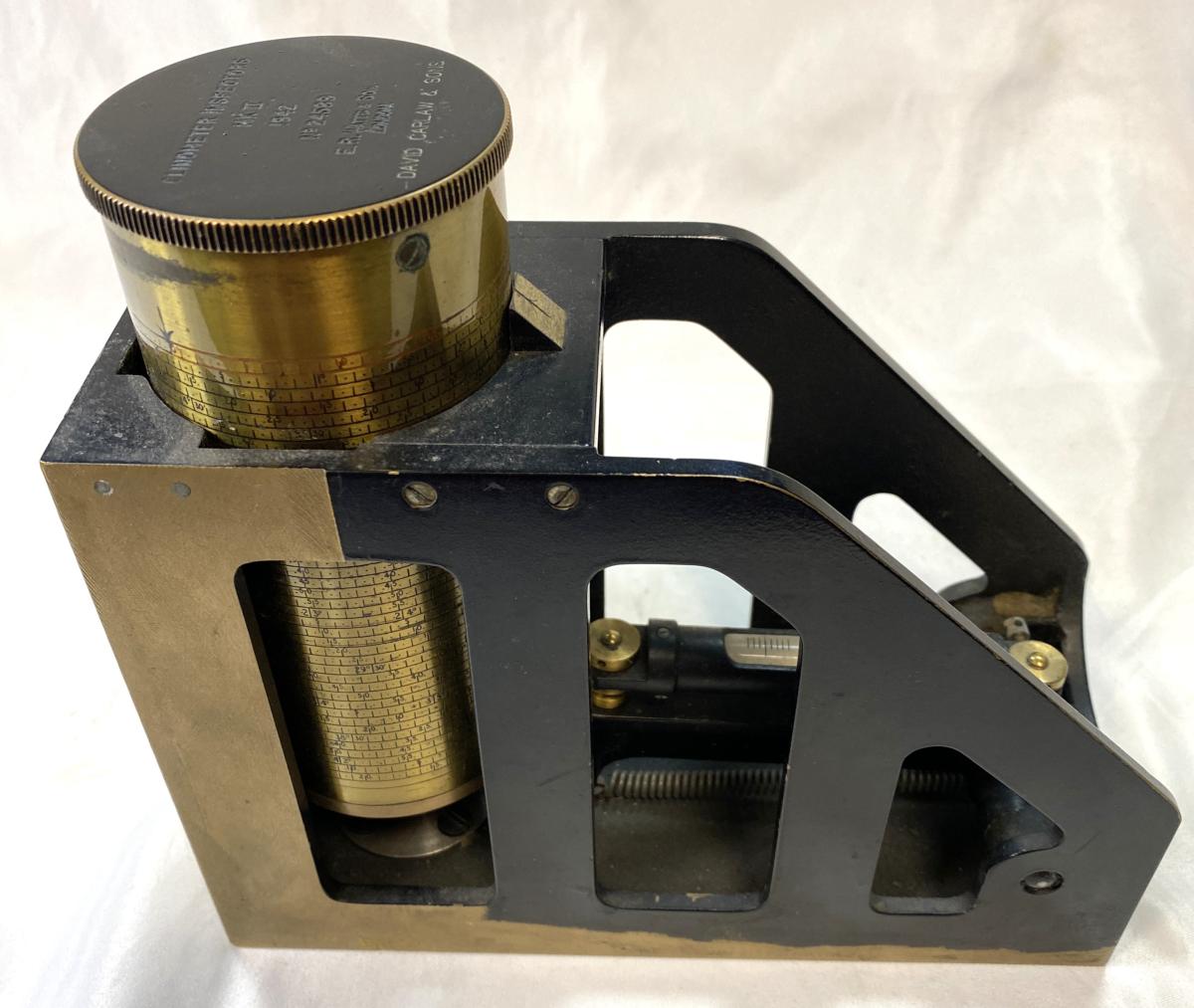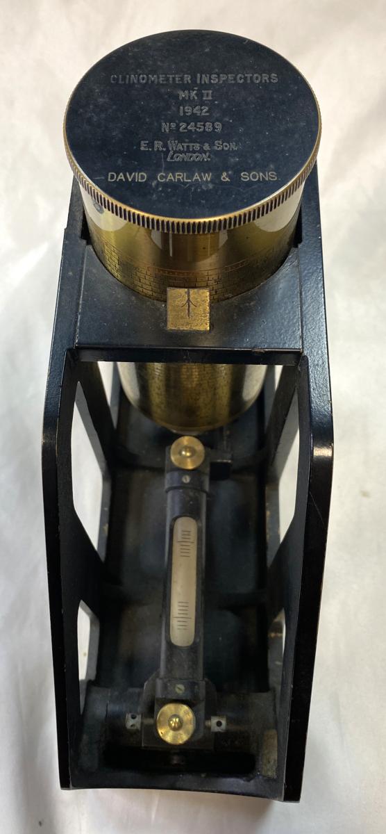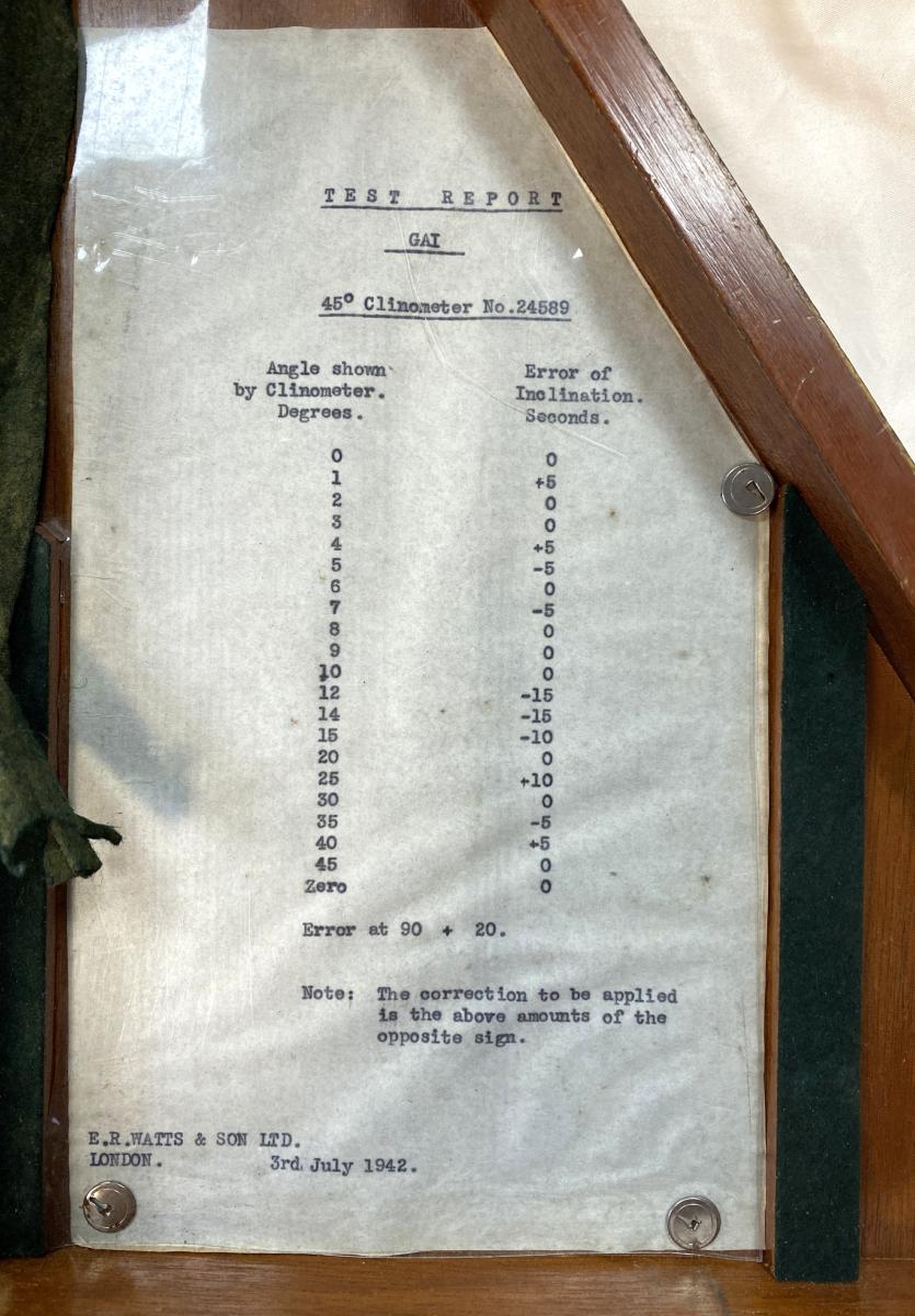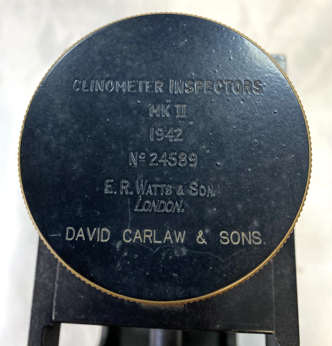 WW2 British MKII Clinometer In Transit Box: Dated 1942.Maker stamp 'E.R. WATTS & SON LONDON' with 'DAVID CARLAW & SONS' below . Used to lay the elevation of a gun barrel.