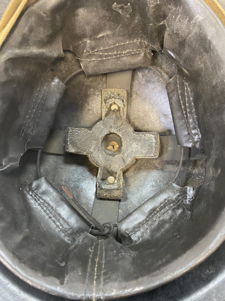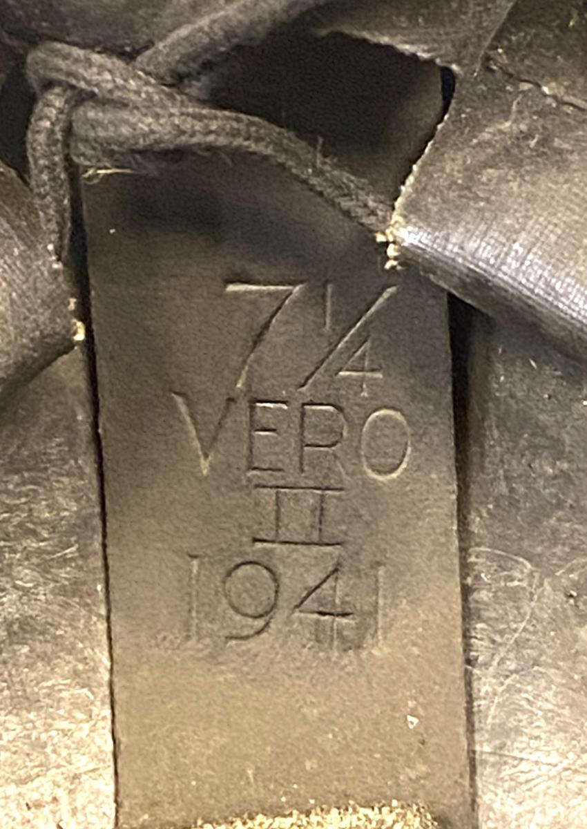 Warden Plastfort MKII helmet of bakelite construction. Helmet liner frame maker stamped 'VERO II 1941' and size 71/4. Rubber pad and canvas chinstrap with hardened black liner.