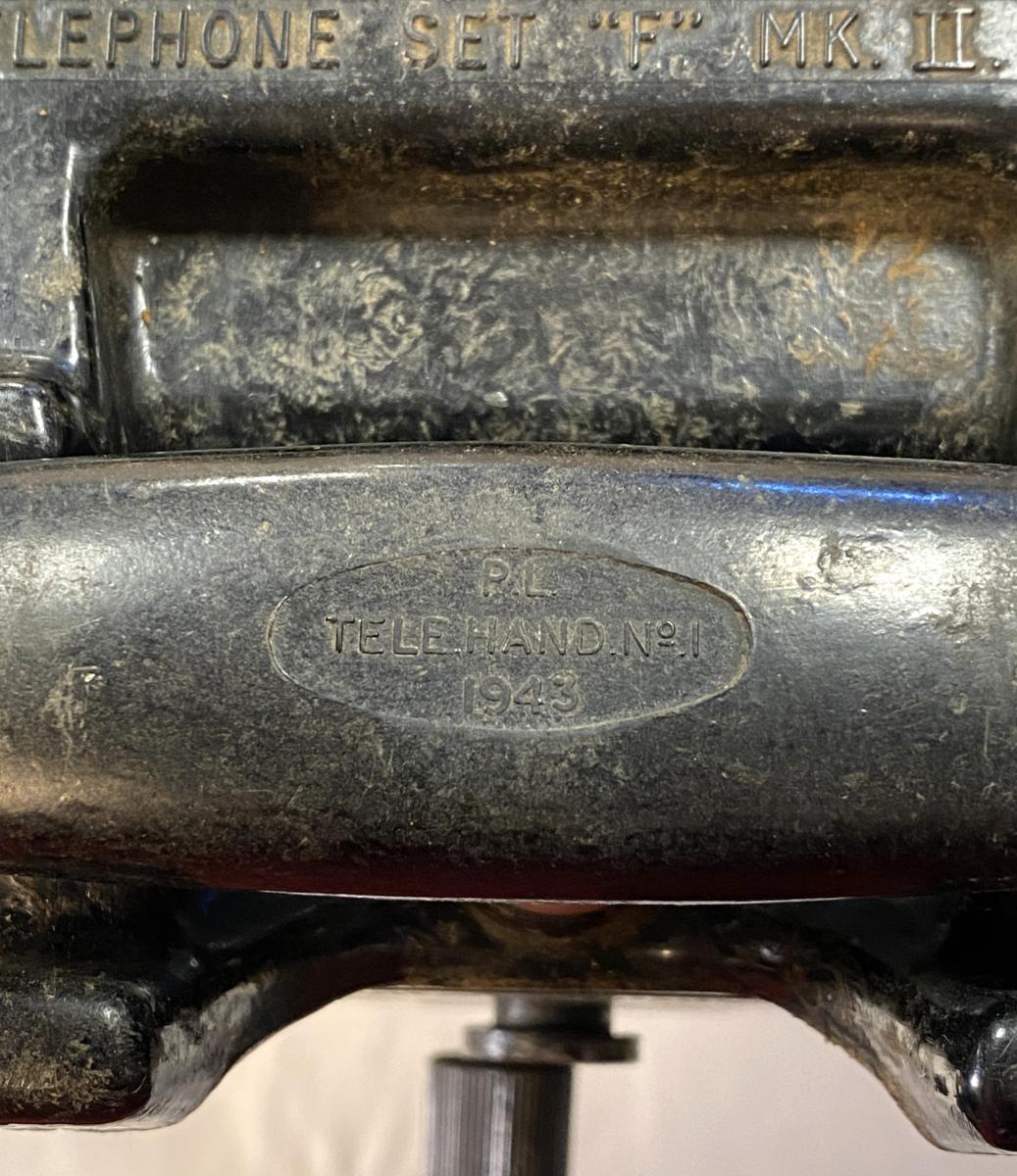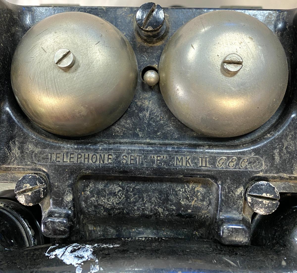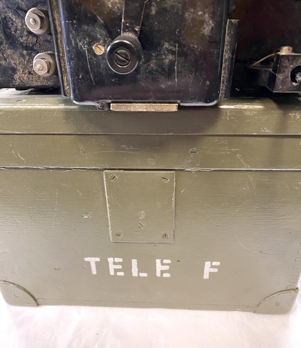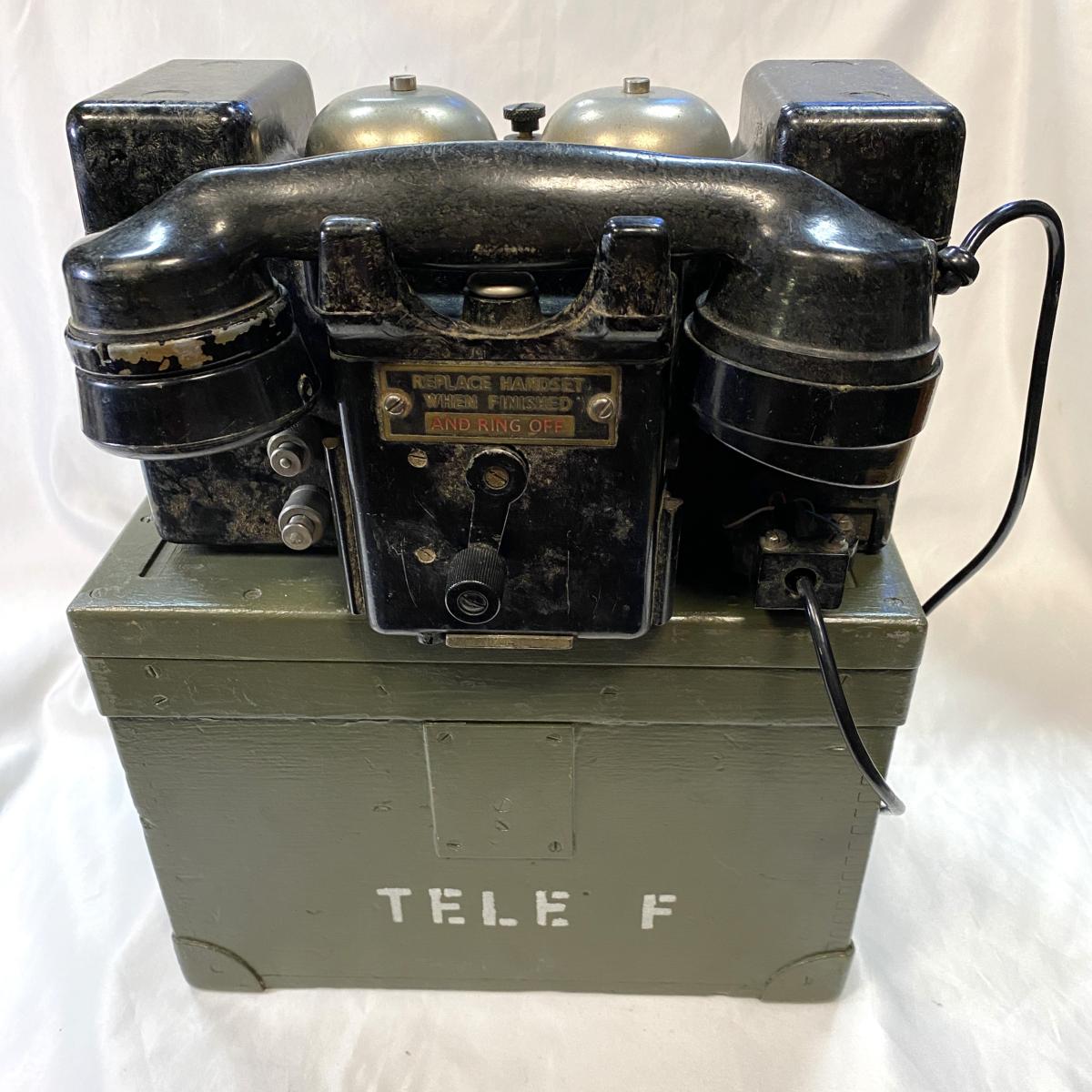 Bakelite phone in transit box which retains most of its original paint with TELE F stencilled on box. Phone may have a post war cable as these phones were still being used by the British Army after WW2.Phone is in very good condition.