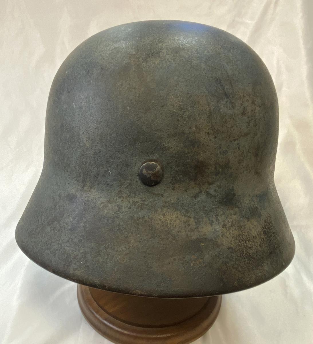 | M40 combat helmet acquired from a veterans family. The soldier brought it back and it has been stored for decades in a garage and forgotten about, literally untouched since the war. As a result it has acquired a degree of oxidisation to the surface, the helmet shell shows a faint amount of light camouflage. The eagle decal is almost perfectly intact with just a small blemish to one leg of the eagle and a small blemish to the swastika. Some rust to interior of the shell, the liner is complete with its original drawstring. Shell size is NS6? with the last number difficult to identify. Batch number stamp D102. We have added a high quality replica chinstrap. A nice looking helmet. |