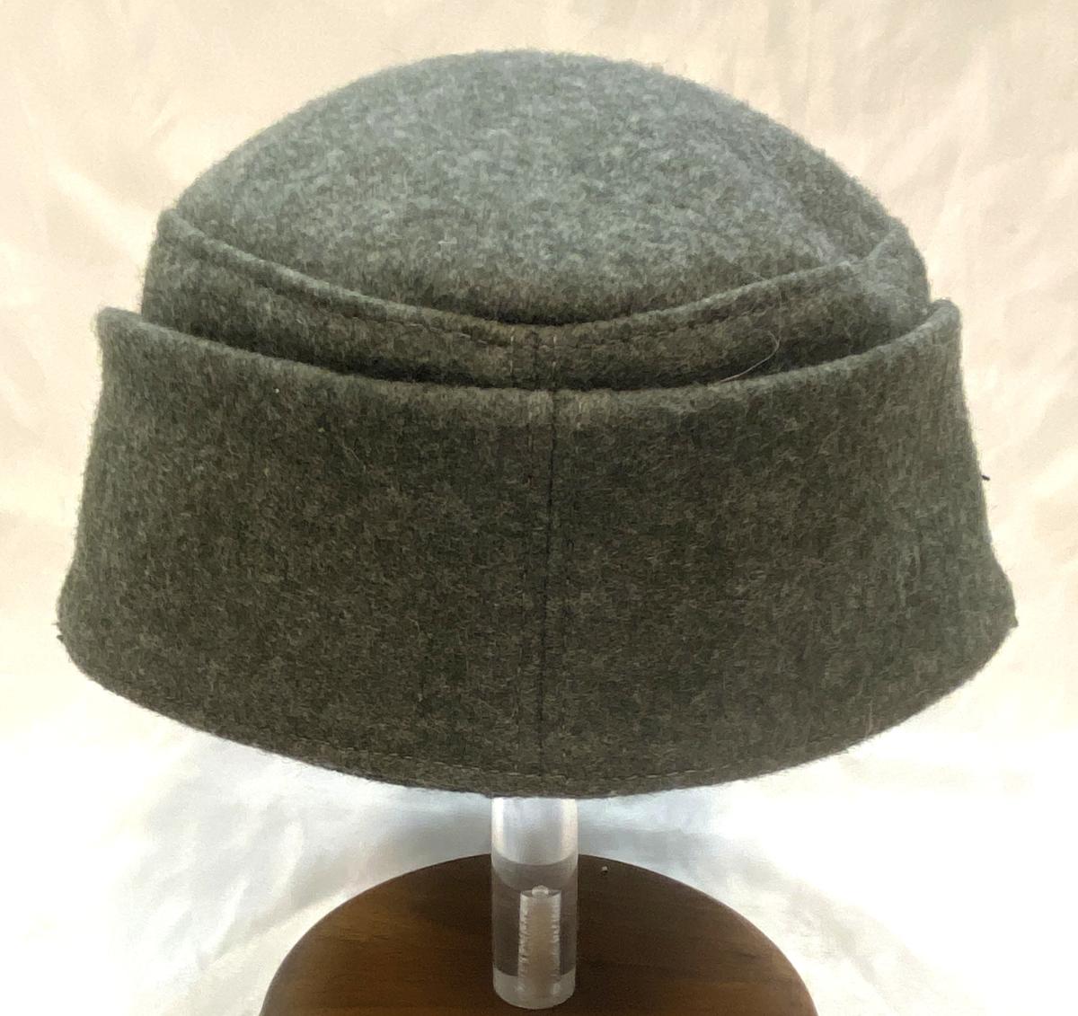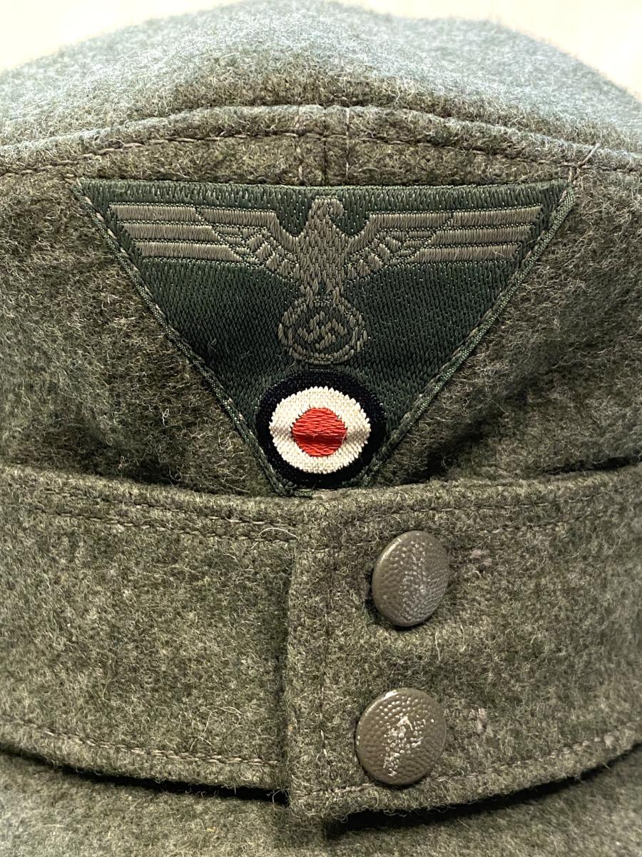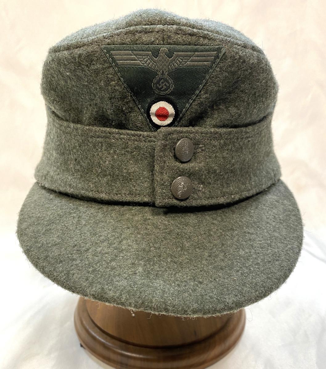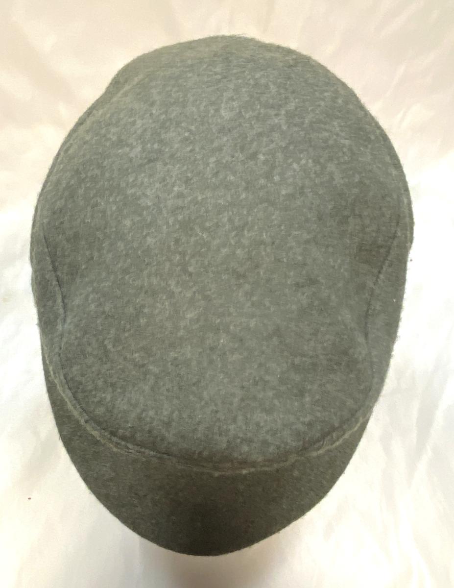 | Feldgrau wool rayon construction cap. Two pebbled metal buttons to front closure flaps. Machine stitched insignia to front comprising trapezoid rayon base with machine woven eagle and swastika above tricolour cockade . Cotton rayon blend interior with 56 size stamp. |