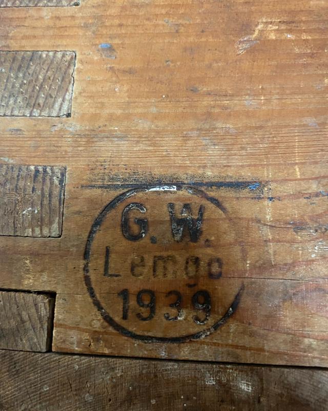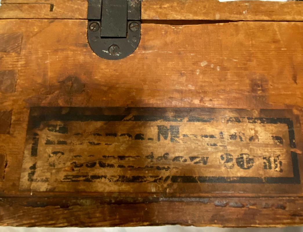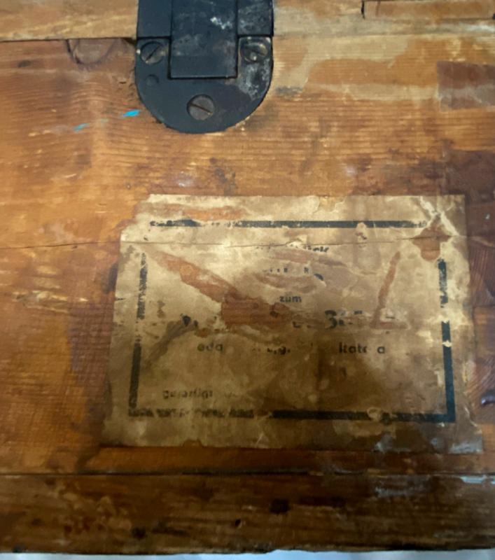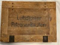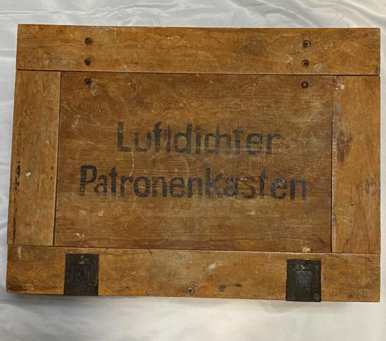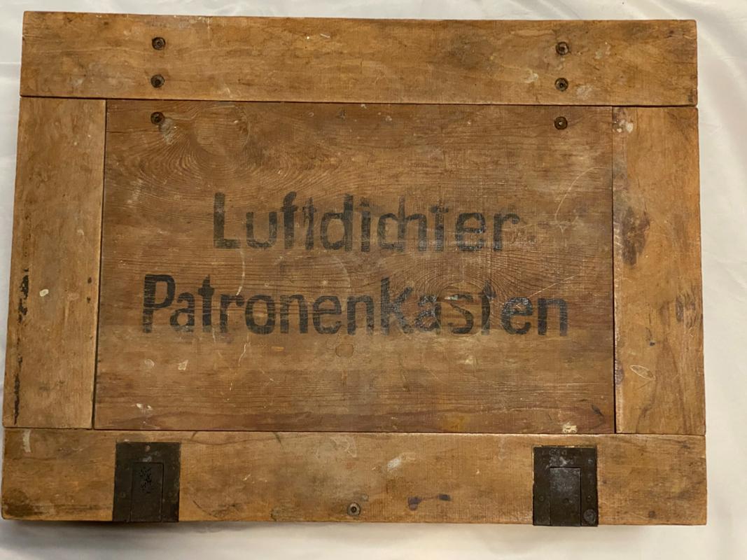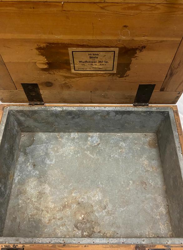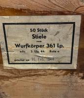 Very rare 16th Feb 1944 dated Flare Gun grenade case for carrying 50 grenade projector stems. Original labels to inside and outside of box. Maker stamped 'G.W. LEMGO 1939' . Front writing translates as 'AIRTIGHT CARTRIDGE BOX' .  Internal lid box label translates as '50 Piece Stems for the Projectile 361' .Box in excellent condition with steel closure locking clips in working order.