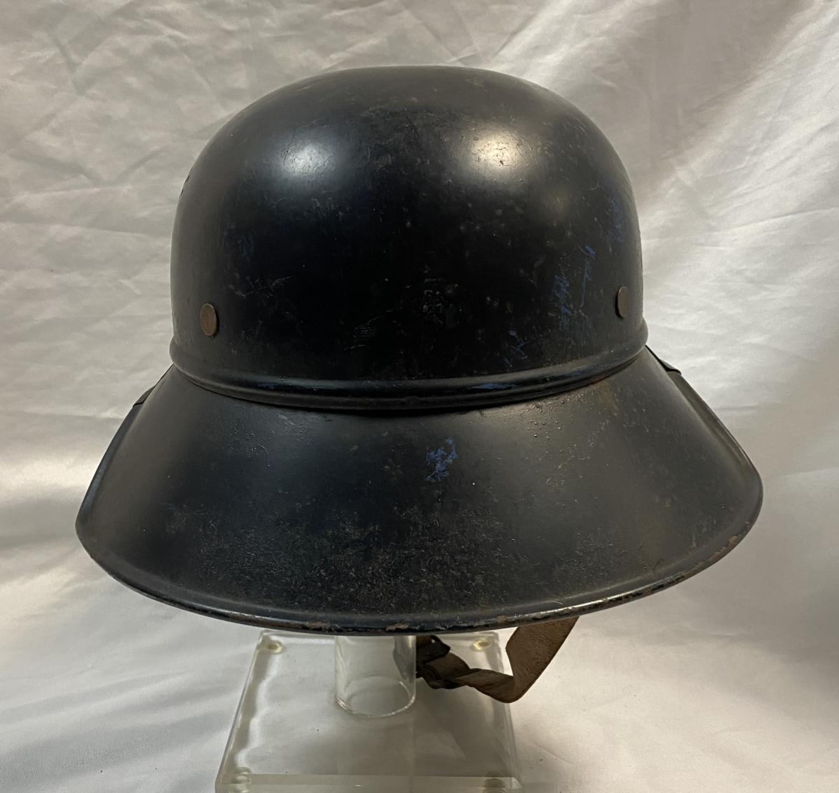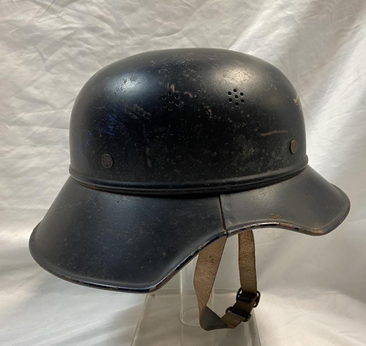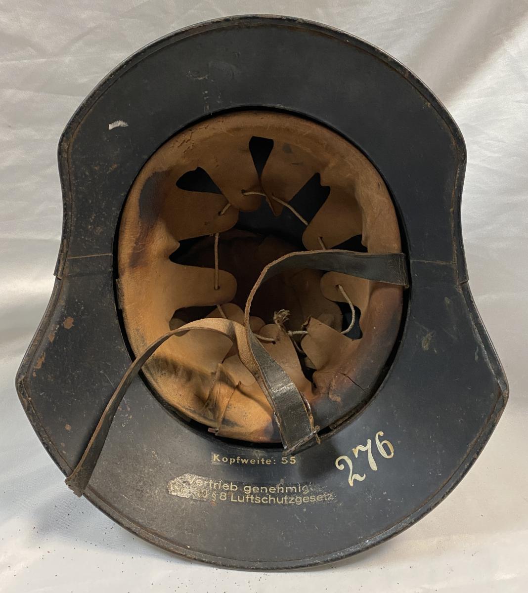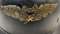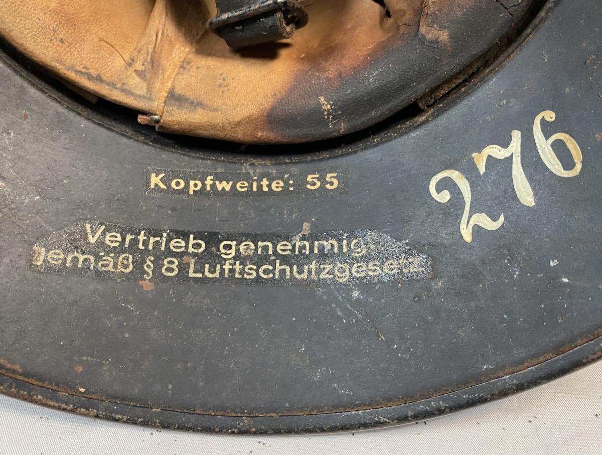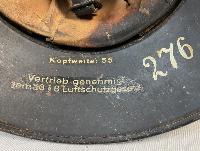 | Dark blue paint with Luftschutz decal in very good condition. The rear inner skirt is stamped with the pricing details including the highest authorised sale price of 8 Reich marks. Complete with liner which is stamped H.J. S/19 a. The strap is snapped at one end. |