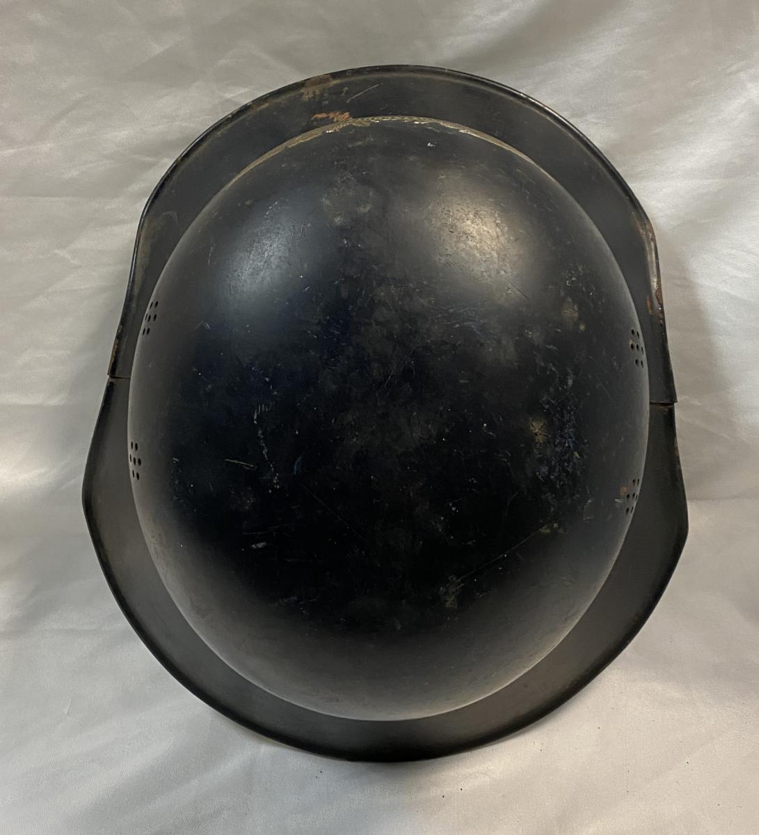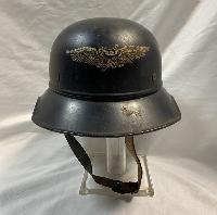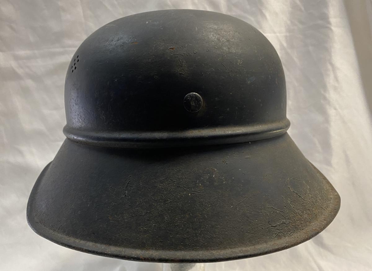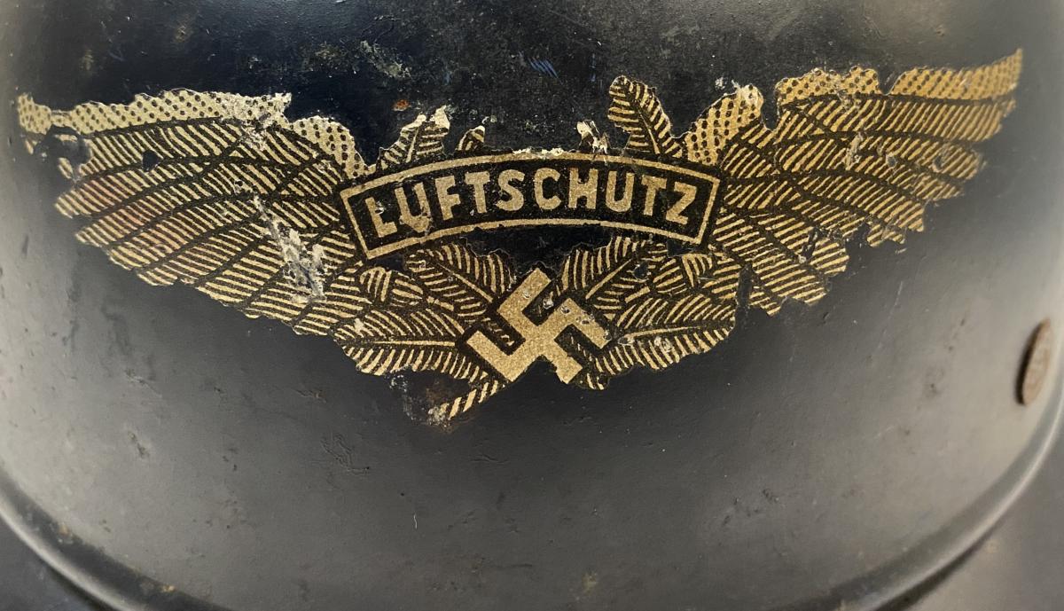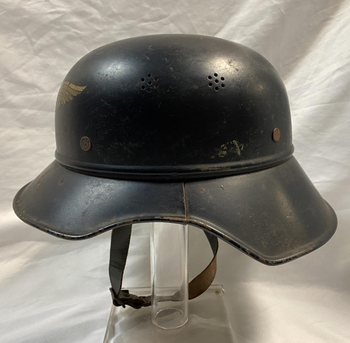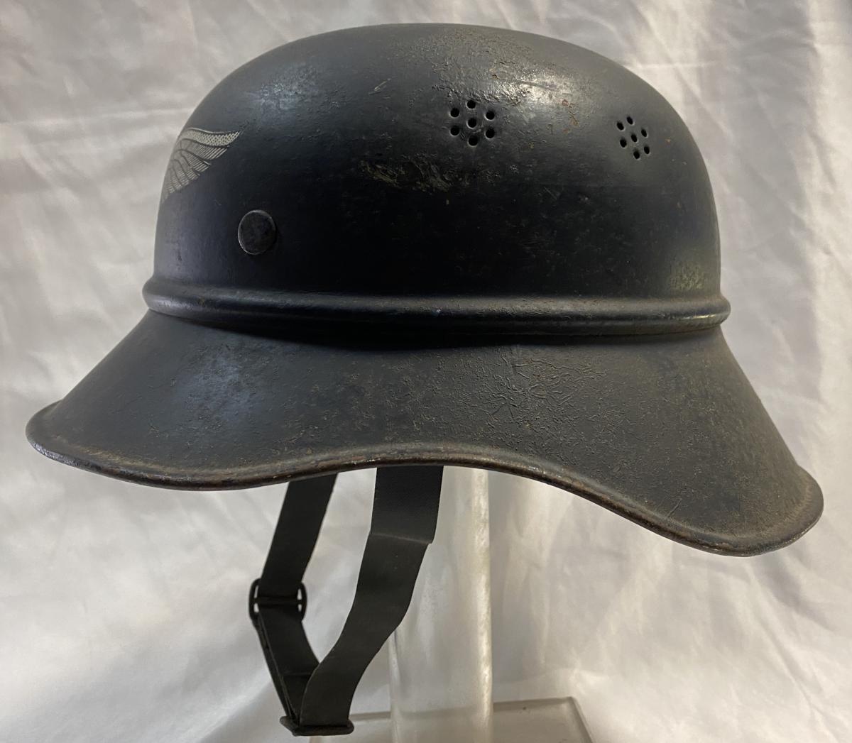 | Dark blue paint with Luftschutz decal in very good condition. The rear inner skirt is stamped with the pricing details including the highest authorised sale price of 8 Reich marks. Complete with liner which is stamped H.J. S/19 a. The strap is snapped at one end. |