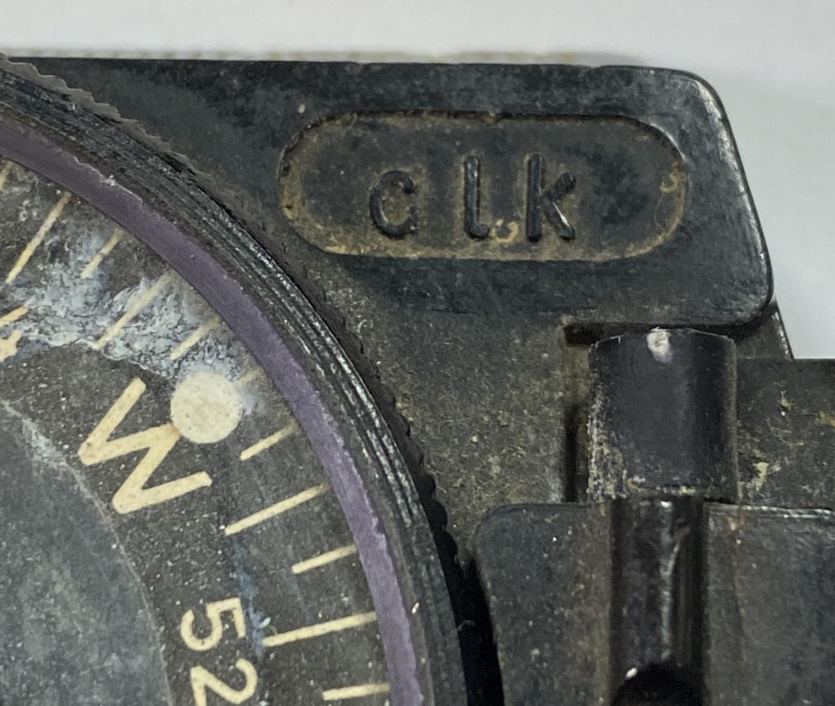 Maker stamped 'clk' . Bakelite base with alloy lid and mirror. Bakelite base is number stamped