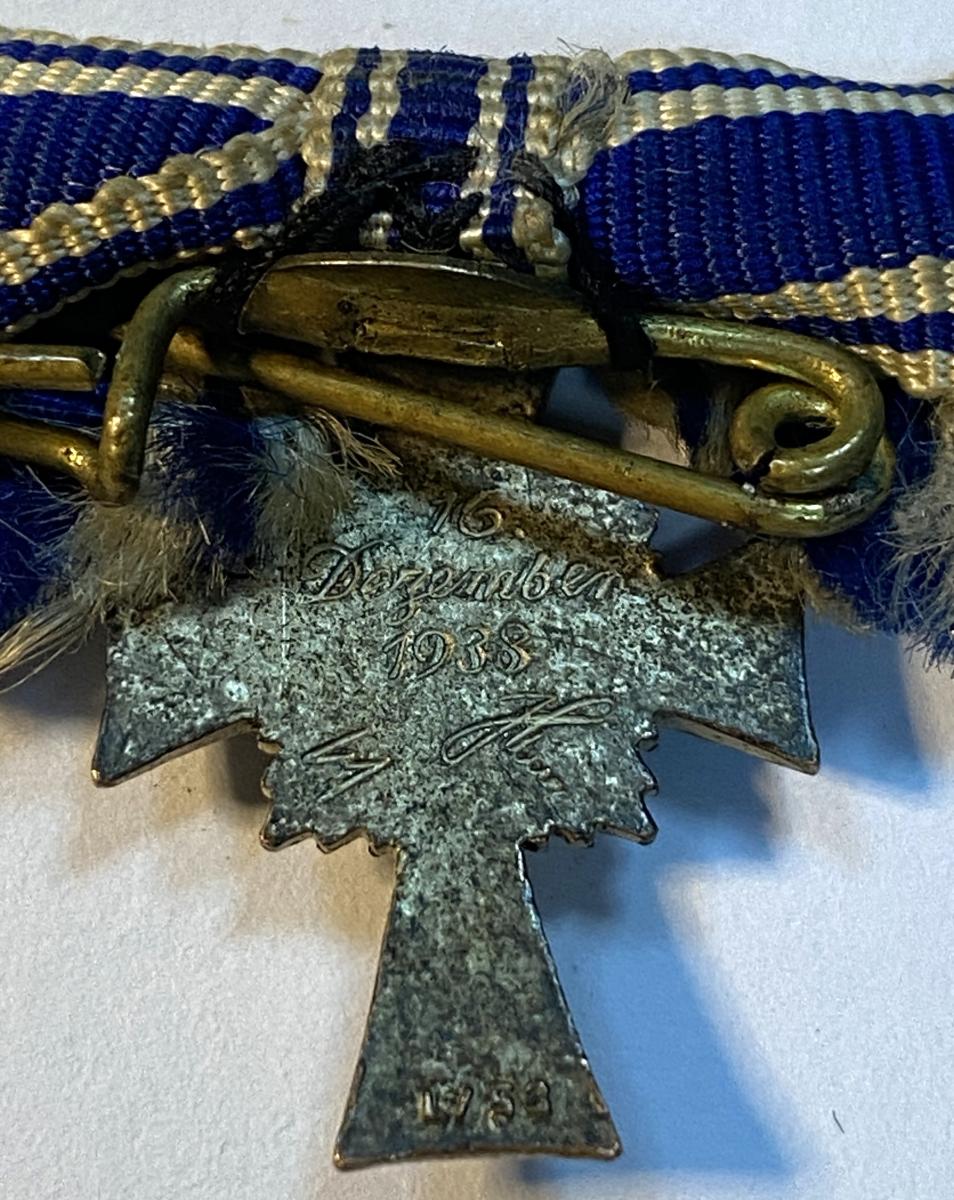 Lapel version with ribbon formed into a bow. Maker stamped L/53 for 'Hymmen & Co, Ludenscheid Karlstr'