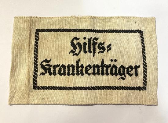 Auxilliary stretcher bearer armband. White cotton rayon blend construction with machine woven black gothic script.