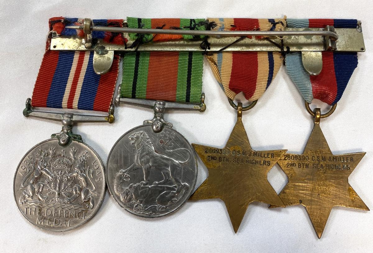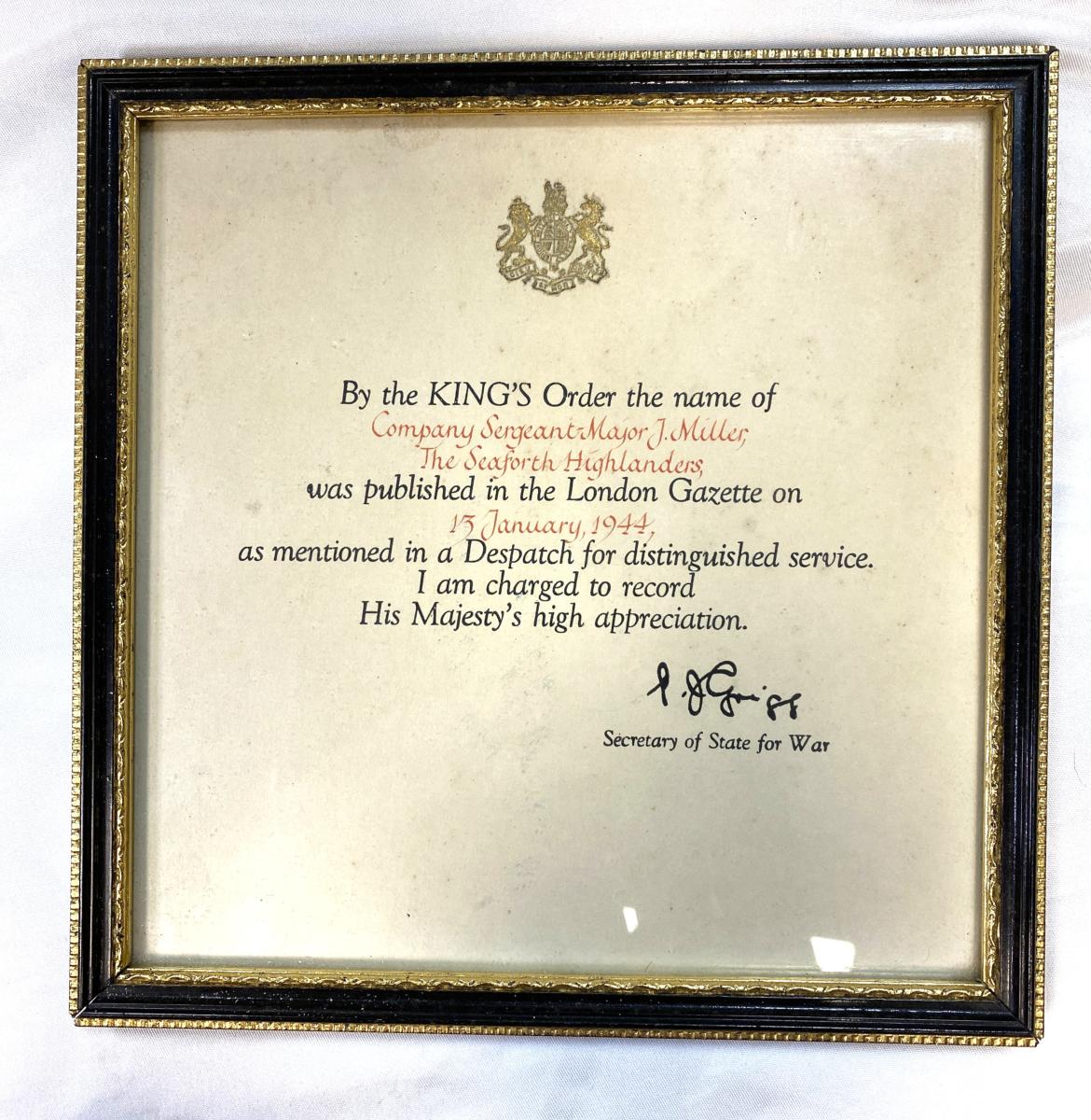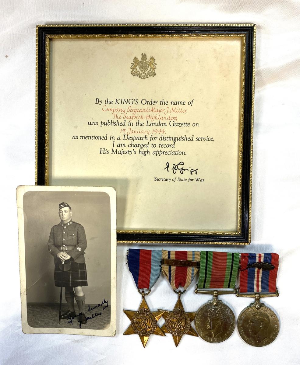 2809390 CSM J.MILLER 2ND BTN SEA HIGHLRS. Medal Stars are engraved to reverse. MID cypher to War medal and 8th Army clasp to Africa Star. Photograph signed to front of postcard with sender address to reverse. Nice framed certificate dated 13th January 1944.